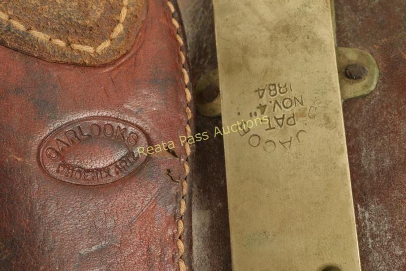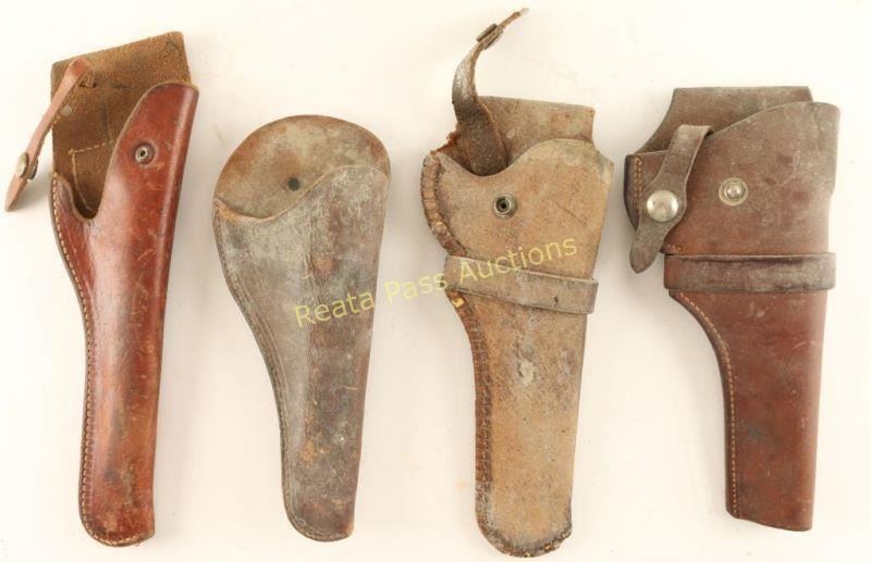 1 smooth brown leather stamped "Garlooks Phoenix, Ariz", 1 smooth brown leather stamped "Geo. Lawrence Steerhyde Portland, OR", 1 older holster with metal belt loop marked 'B. Jacob Pat. Nov. 4 1884' shows age and 1 older holster with whipstitched sides which also shows age and use.