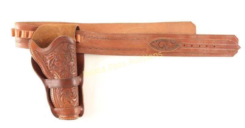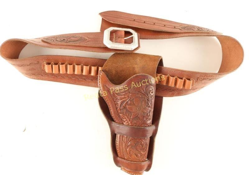 Brown leather with tooled floral design. Belt holds (20) rounds and holster could be used for Colt double action. Belt approx 45" long. Showing light use and aging.