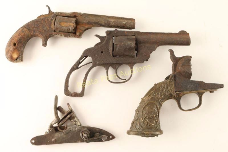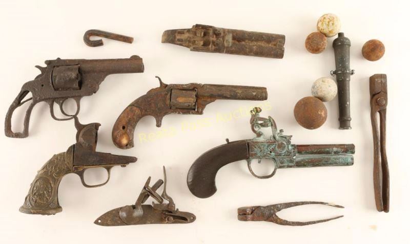 Including several large lead balls, locks, two rusty revolvers, an interesting pair of brass grips with war scene and much much more...