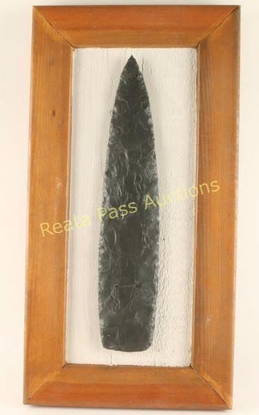 Obsidian blade by Emery Koontz found in three pieces and restored. Blade measures 15 3/4" long mounted on painted wood and framed.