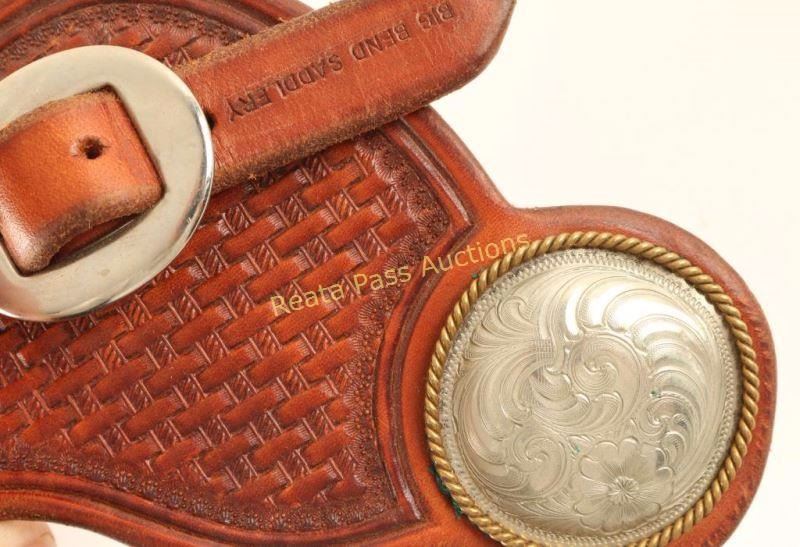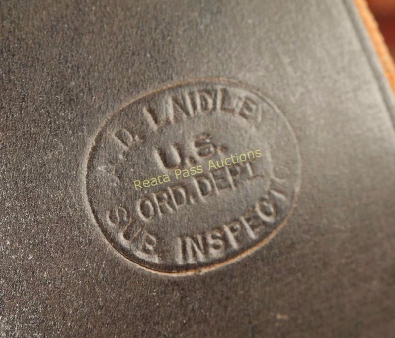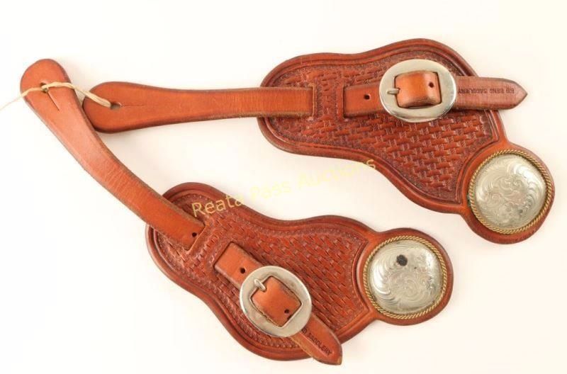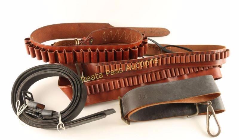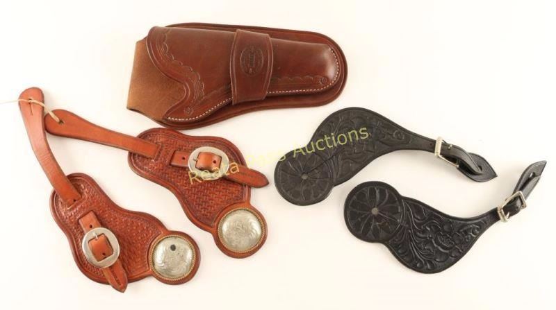 Leather shotgun cartridge belt, cartridge money belt, Civil War carbine hanger stamped 'E Gaylord A.D. Laidley US Ord Dept.', Bachman SA holster for a 5 1/2", pair of spur straps made by Big Bend Saddlery with engraved conchos, pair of black floral tooled spur straps, cartridge and regular belts also included.