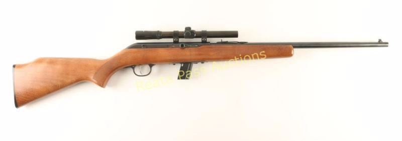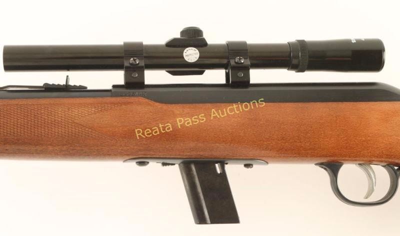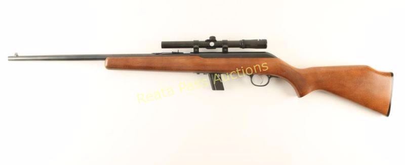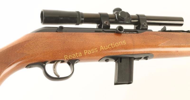 Canadian made semi-automatic sporting rifle chambered in .22 Long Rifle. Features a blued finish, 20.25" barrel, blade front sight, adjustable rear sporting sight, Tasco 4x 15mm scope, serrated charging handle, 10 round detachable magazine, beveled trigger and one piece checkered hard wood stock with serrated black plastic buttplate. Rifle exhibits approximately 98% of it's original finish showing only light wear. Action is smooth, bore is excellent and wood stock is fine. Condition is excellent. ***Modern Firearm***