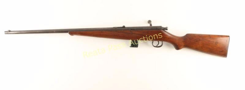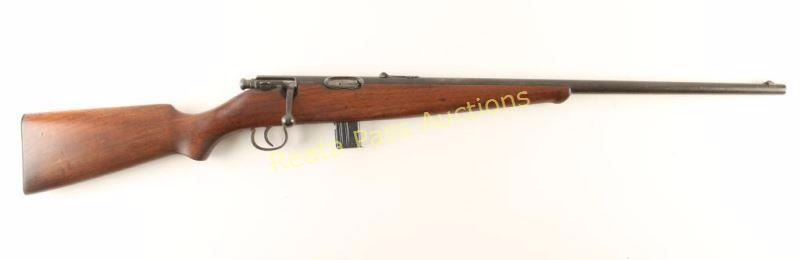 Magazine-fed bolt action sporting rifle chambered in .22 Long Rifle. Features a blued finish, 23.5" barrel, blade front sight, adjustable rear sporting sight, detachable magazine, manual safety, and one piece smooth wood pistol grip shoulder stock with schnabel forend. Rifle exhibits an even dark brown patina overall. Action is sound, bore is very good and wood stock is good with a crack to the left of the receiver. Condition is fair to good. ***Modern Firearm***