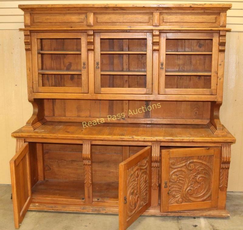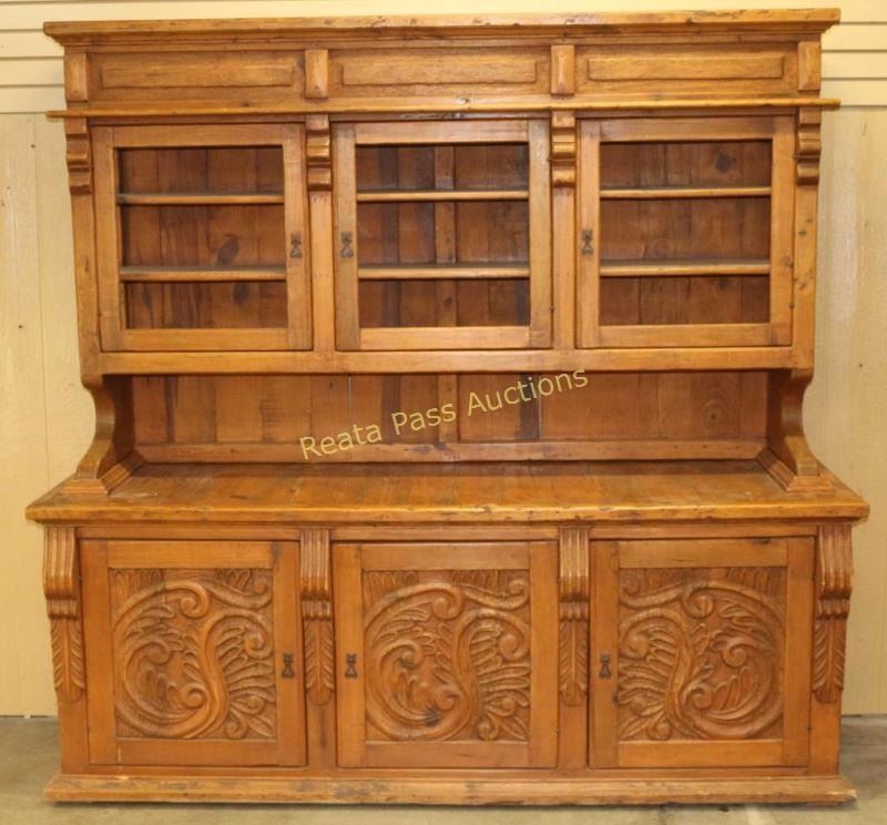 Large hutch with 3 upper gallery doors that are open framed for displaying china or curios. Lower gallery has 3 ornately carved doors, all have scrolled metal pulls. Measures 82"l x 78"h x 24 1/2"w.