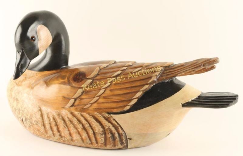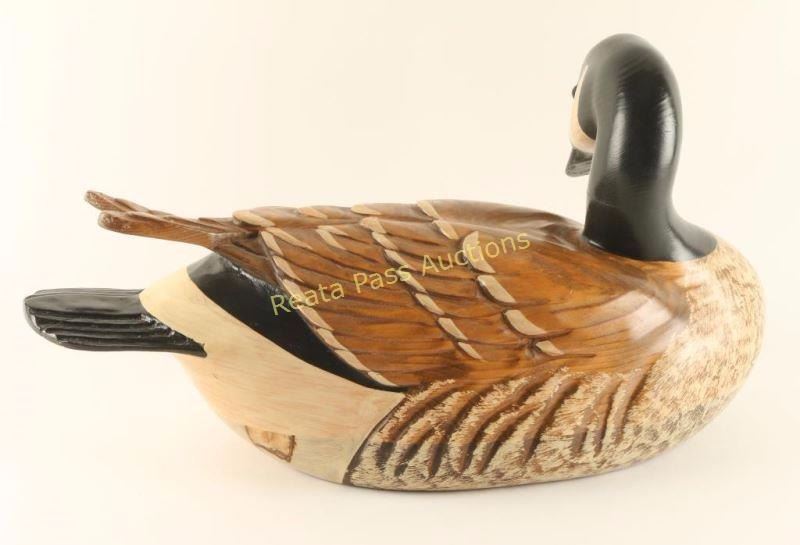 Canadian Goose, stained and hand painted with glass eyes. Measures 19"x11"x7". Signed by artist on bottom. Tom Taber carves and hand finishes the birds that are made of select woods of the Northwest, recreating the craftsmanship of early American wood sculptors. Tom brings to his art imagination and a love of nature, he learned wood carving from a favorite uncle as well as from his father and grandfather.