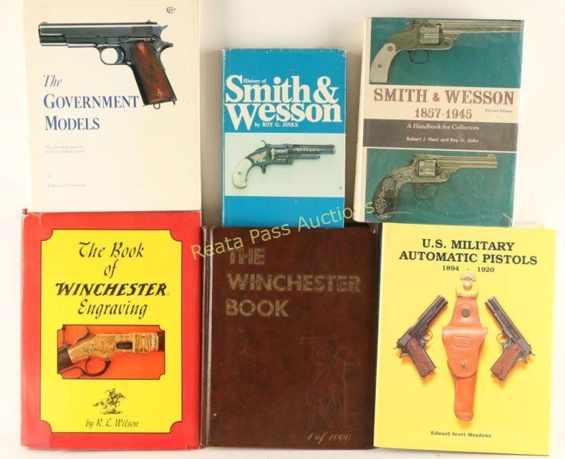 6 total including; "History of Smith & Wesson" by Roy G. Jinks, "The Government Models" by William H. D. Goddard, "U.S. Military Automatic Pistols 1894-1920" by Edward Scott Meadows, "Smith & Wesson 1857-1945" by Robert J. Neal and Roy G. Jinks, "The Winchester Book" 1/1000 signed by the author 1979 edition, some staining on front pages, and "The Book of Winchester Engraving" first edition copyright 1975 by R.L. Wilson.