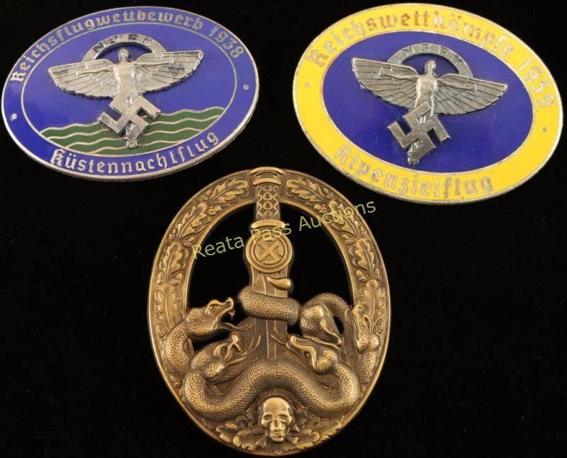 (1) Army Gold Anti Partisan Badge. Has a wide vertical pin back that is maker marked '1'. Stamped brass construction. (1) 1939 NSFK Glider Korps Alpenzielflug Badge. Measures 2 5/16" wide by 1 11/16" tall. The reverse side is maker marked 'ges gesh PJC'. Has a thin horizontal pin back. Two piece three donut rivet nickel construction with enamel. (1) 1938 Glider Korps Kustennachtflug Badge. Measures 2 3/16" wide by 1 9/16" tall. The reverse side is maker marked 'O Fechler Bernsbach'. Has a thin horizontal pin back. Two piece three donut rivet nickel construction with enamel. Offered "as is", we don't guarantee the authenticity of this item, please do your research. All sales are final.