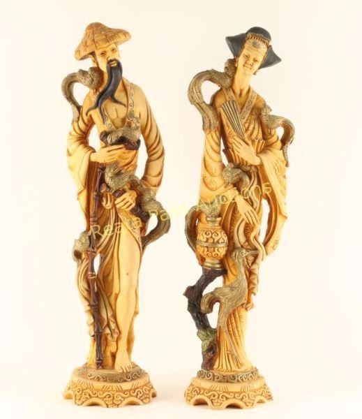 Made of resin, these statues of an Asian man and woman were made in Italy, from the late 1960's and in good condition overall with some minor chips at the base. Each measures 20" high.