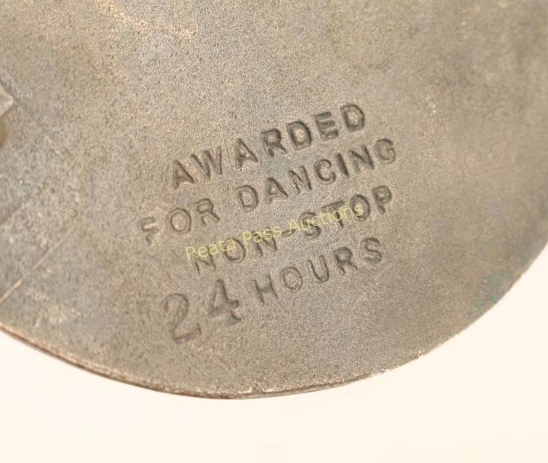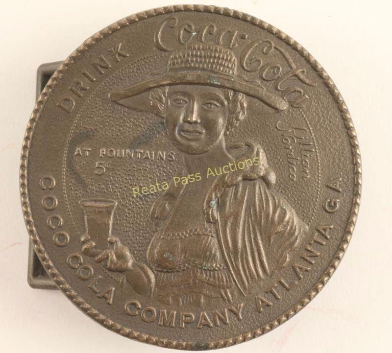 Repro round bronze finish metal buckle features molded lady in straw hat and vintage clothing holding a glass of Cola with "Drink Coca Cola, Coco Cola Company Atlanta, GA". Back has Tiffany London hallmark and "Awarded for dancing non-stop 24 hours"