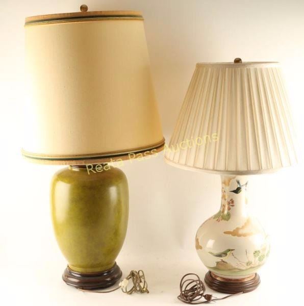 1 Chinese porcelain lamp with floral and bird motif. 1 green ceramic lamp.