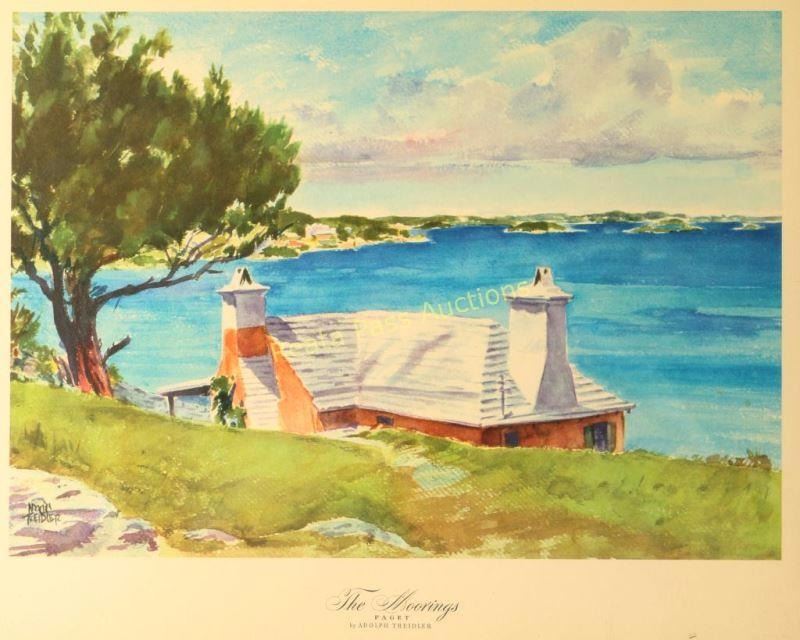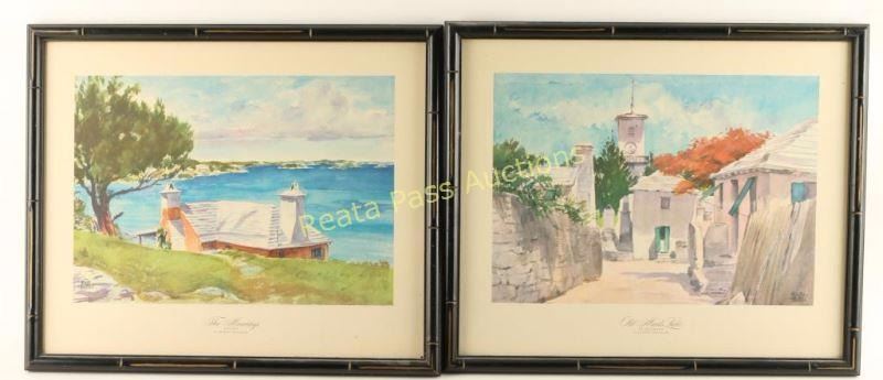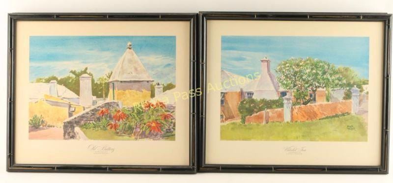 Adolph Tridler artist entitled "The Moorings","Water Lot Inn", "Old Buttery", and "Old Maids Lane". Image sizes 14"x10" in black faux bamboo frames.