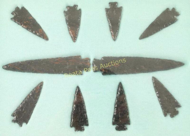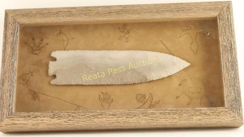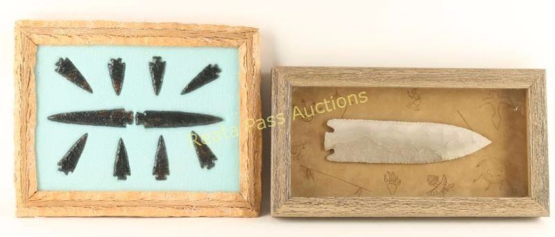 1 large 9" point "Grey Ghost" mounted on suede matboard that has Native American symbols drawn on it in rustic wood frame. 1 collection of contemporary obsidian points, 10 total, inset into fabric with rustic wood frame. Measures 8"x11" in fabric area. Both unknown age or origin.