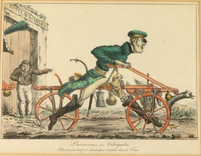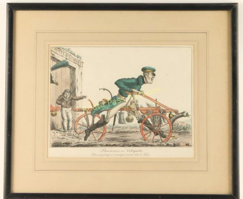 "Draisiennes Dites Vilocipedes" Depicting man on bike chasing a goose. Image measures 11 1/25"x9 1/2" with mat and black frame.