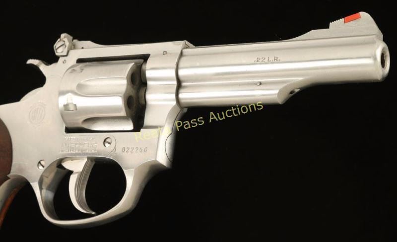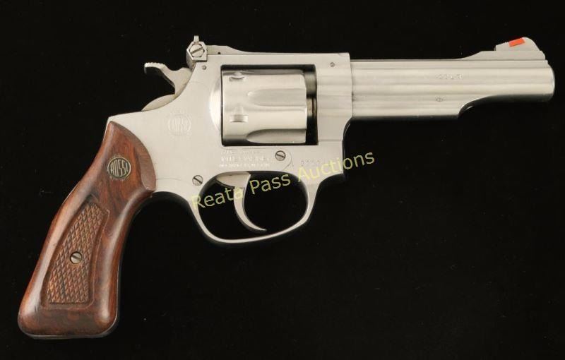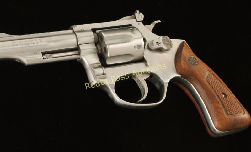 Brazilian made stainless steel double action revolver chambered in .22 Long Rifle. Features a brushed finish, 4" ribbed barrel, ramped front sight with orange insert, adjustable rear window sight, fluted six shot cylinder, checkered hammer spur, serrated trigger, and checkered hard wood stocks. Pistol shows light holster wear and a few minor scuffs. Action is crisp, bore is excellent and grips are fine. Condition is very good+. ***Modern Firearm***