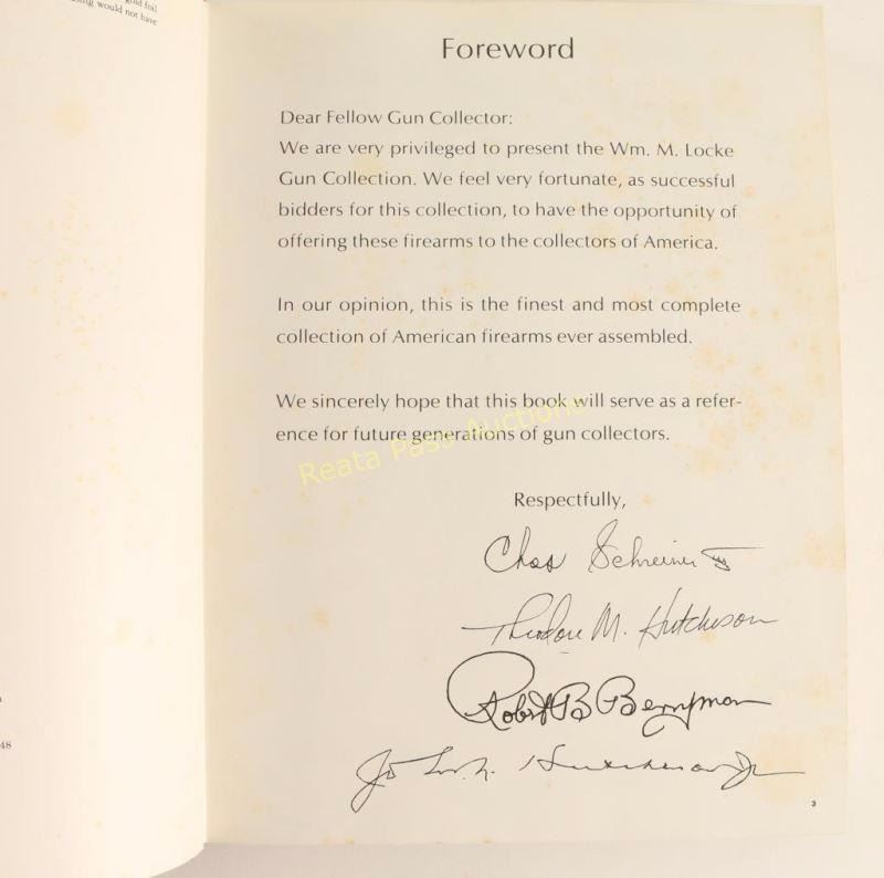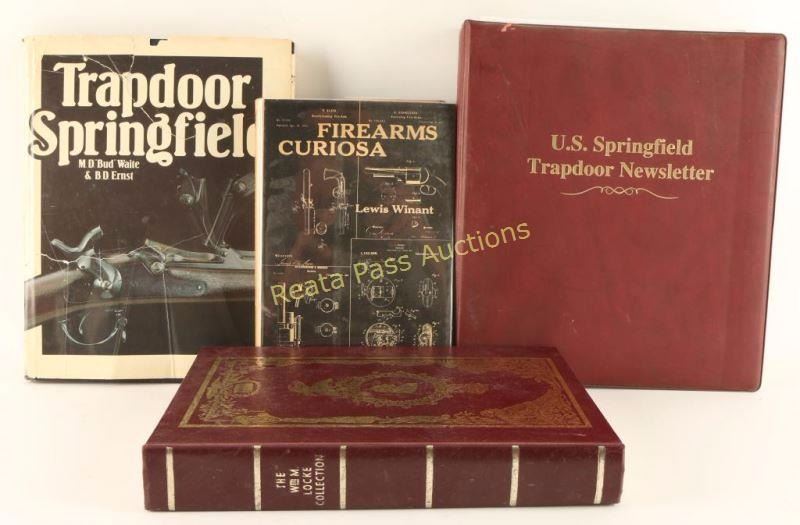 Including: "Firearms Curiosa" by Lewis Winant, "The William M. Locke Collection" by Frank M. Sellers, signed, some staining on front and back pages, "Trapdoor Springfield" by M.D. "Bud" Waite & B.D. Ernst, and "U.S. Springfield Trapdoor Newsletter" a three ring binder with a collection of newsletters from Summer of 1998 to Winter of 2000 by Frasca Publishing, Springfield, OH.