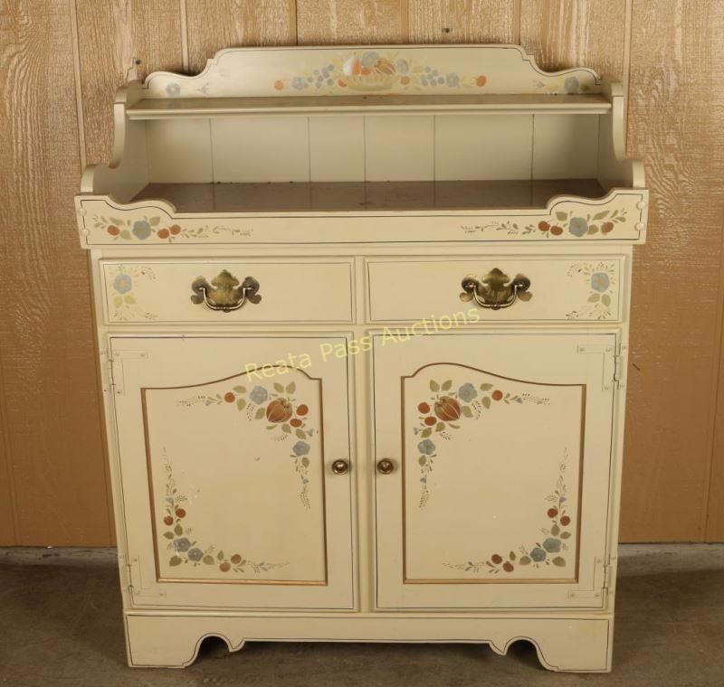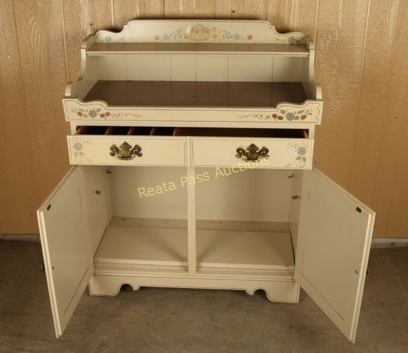 White finish with a floral and fruit stencil. Has 2 lower gallery shelves and a single drawer, could be used as a kitchen storage piece or as a baby changing table. Measures 33"h x 34"w x19"d