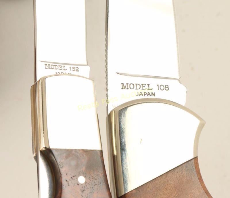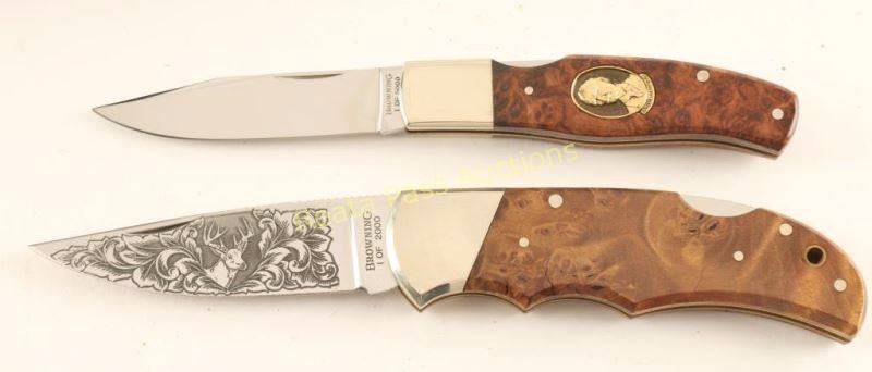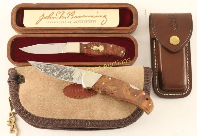 including a limited edition 1 of 5000 pocket knife with burled wood handle and profile portraiat of John Browning in wood case. And a Limited Edition Pocket knife Browning Model 108 1 of 2000 with engraved blade with buck and oak laves with burled wood handle leather sheath and case both are like new condition