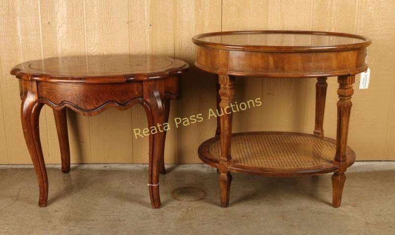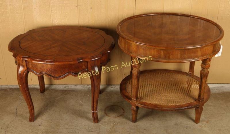 Both with oval tops, 1 with a drawer and brass pull with caned bottom shelf and 1 with scroll shaped sides.