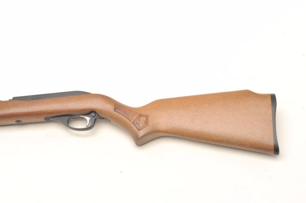 Glenfield Model 60 by Marlin semi-auto rifle, .22 LR caliber, serial #26186760. The rifle is in like new condition with the original shipping box. The rifle features a 22” barrel and full-length magazine. The barrel, magazine and receiver show only light storage marks. The smooth wood stock is in excellent condition with a plastic butt plate. The bore is very good, the action crisp and markings are sharp. This one looks as if it has never been fired. Est.: $50-$100. (Modern).