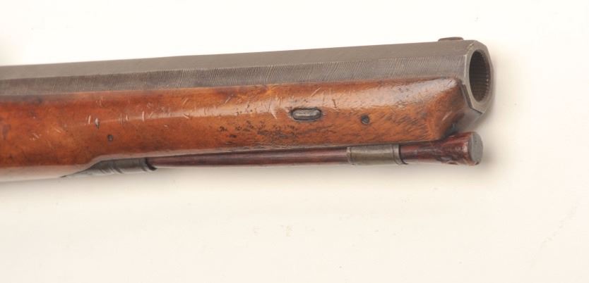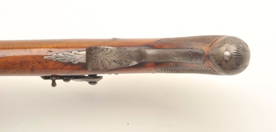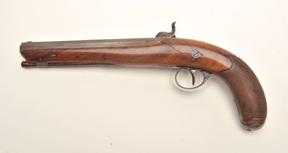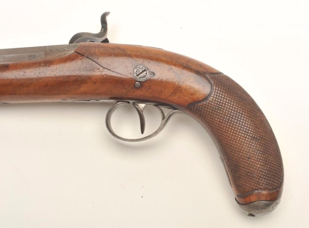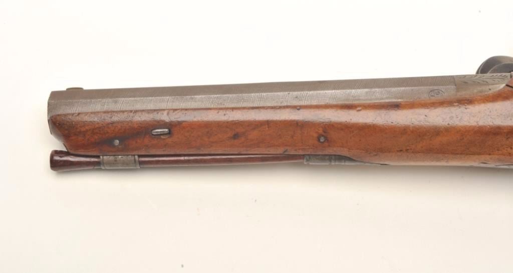 Single shot percussion pistol, unmarked, back action lock, engraved lockplate, hammer, trigger guard and butt cap, 6.5” octagon barrel, full stocked checkered wood with wood ramrod in overall good condition displayinga crisp action, dark patina to metal surfaces and overall good wood with an old crack on the left side of the wood from the breech to the front of the trigger assembly. (Antique). Est.: $250-$500.