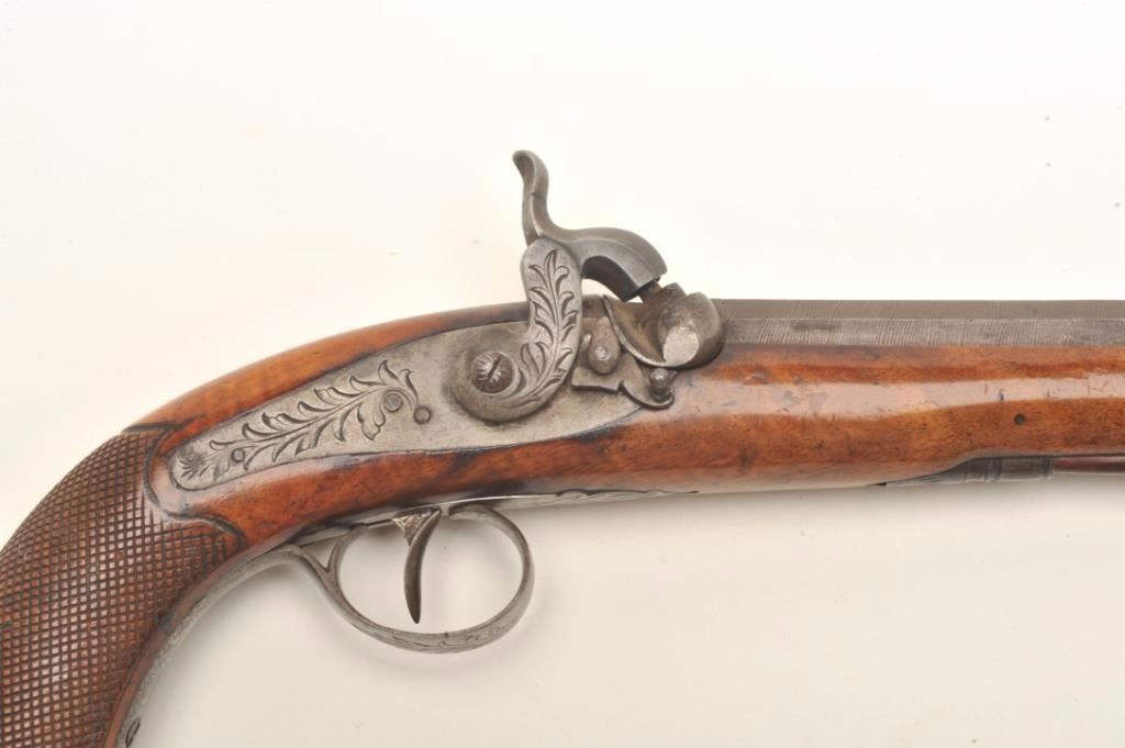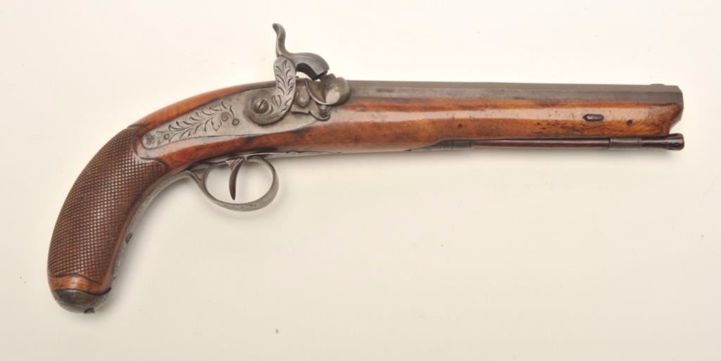 Lot 25 Single shot percussion pistol, unmarked, back action lock, engraved lockplate, hammer, trigger gua