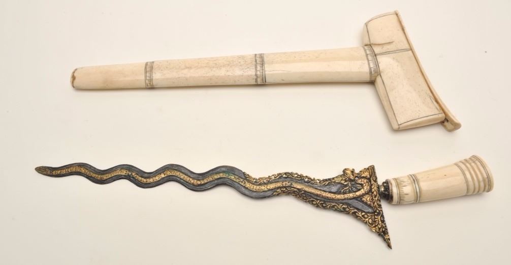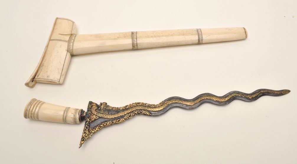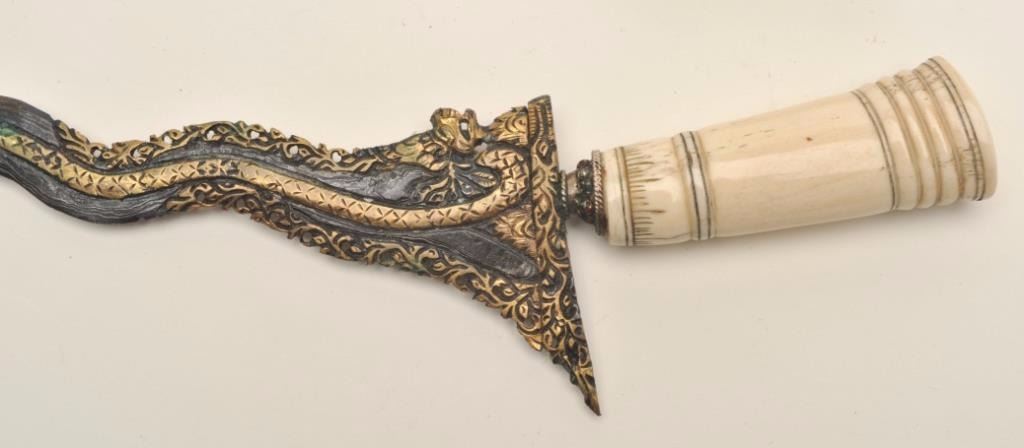 Lot 32 Malaysian Kris dagger with carved bone handle and mounts. The Kris is in very good condition with