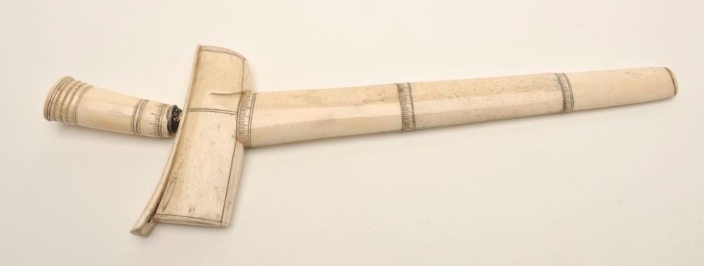 Malaysian Kris dagger with carved bone handle and mounts. The Kris is in very good condition with a 13 ½” blade and an overall length of 17 ½”. The asymmetrical, wavy blade features gold tone accents and depictsa lion’s head. The 4” carved bone handle is in very good condition with gemstones ringing the hilt where it joins the blade. The scabbard is also carved bone with a beautiful patina and small cracks and losses thelength of the scabbard. The dagger was made between 1890-1920 and features old world craftsmanship. Est.: $300-$600.