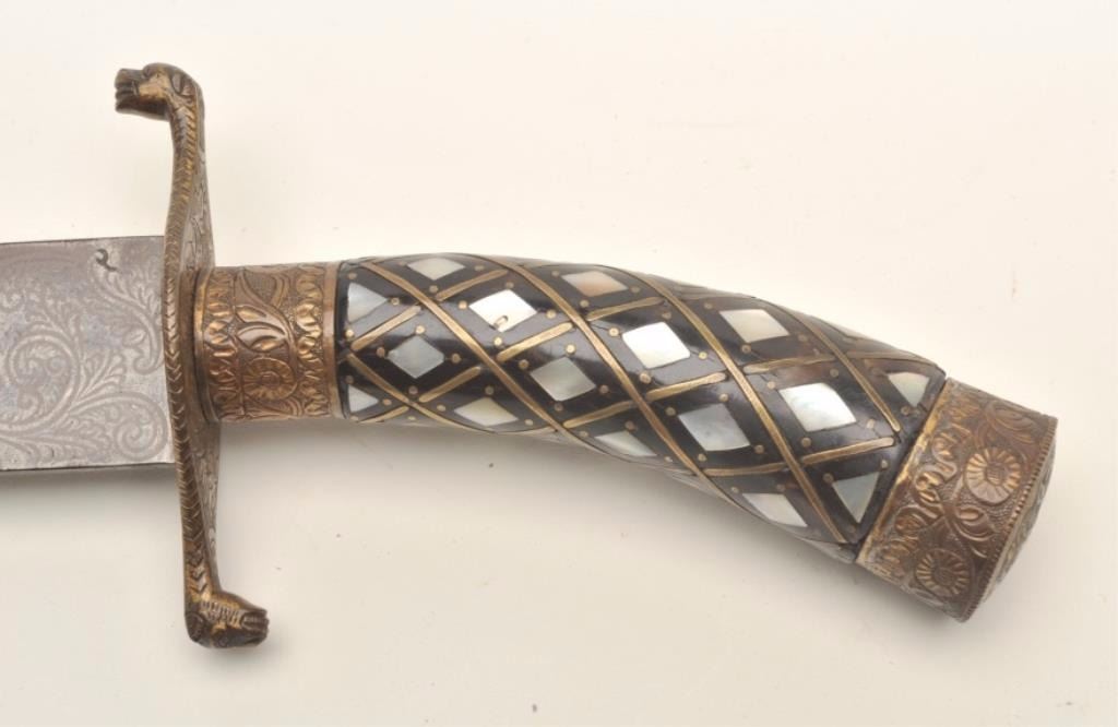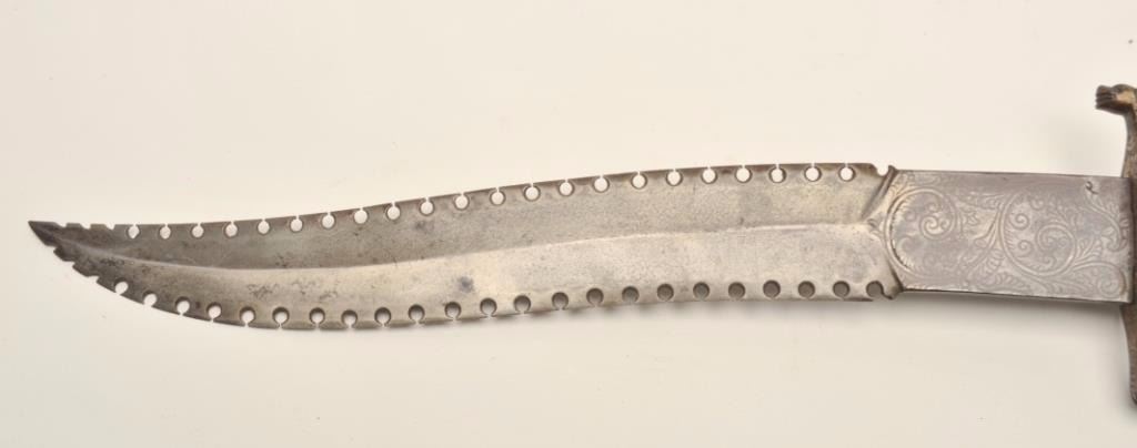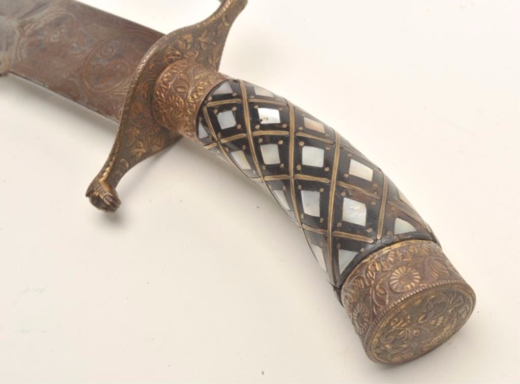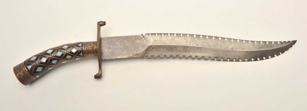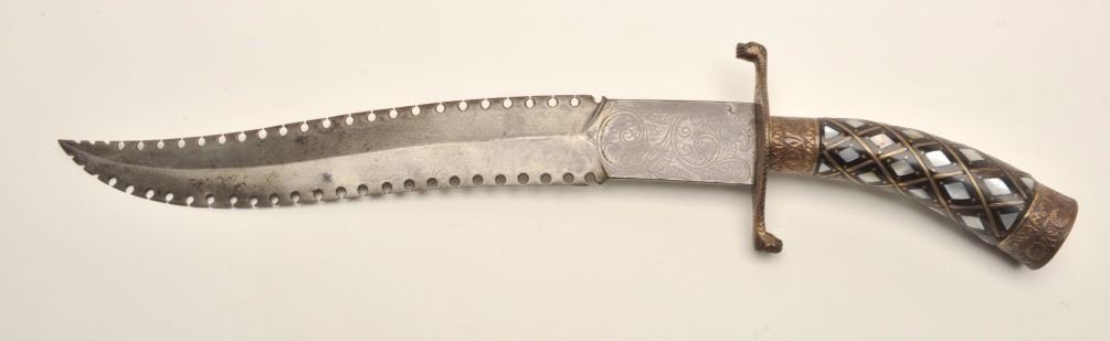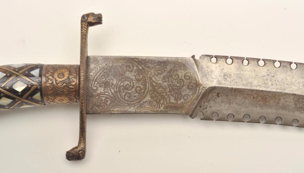 Unusual knife with ornately inlayed handle and 13 ¼” pierced blade. The knife is in very good condition with an overall length of 18 ¾” with a wavy, Damascus looking blade with holes punched along its length. Theblade has a nice, grey patina and does not show sharpening. The handguard is engraved in gold tone with animal heads at both ends. The handle is beautifully inlayed with mother of pearl and accented with gold tonegilt. The knife is believed to be late 19th to early 20th century, approximately 100-150 years old. Est.: $300-$600.