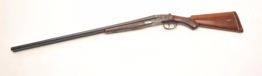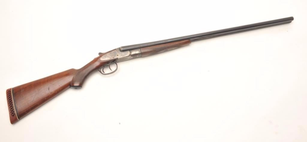 L.C. Smith Field Grade SxS hammerless shotgun, 20 gauge, 28” barrels, blued and case hardened finish, checkered wood stocks, S/N 163736, double triggers, added White Line hard rubber butt pad; in overall goodcondition with crisp actions, good bores, good markings, considerable original muted blue on barrel assembly and considerable original case colors on receiver; some scattered surface rust from storage; underbarrel seam piece has separated and needs re-soldering; wood is overall good with some scattered mars and scratches from carry and storage. (C&R). Est.: $400-$800.