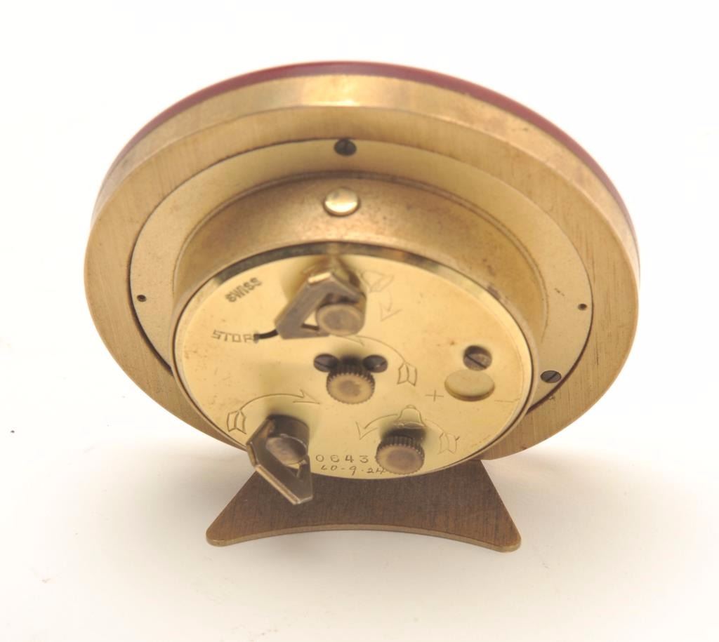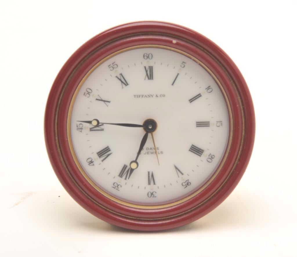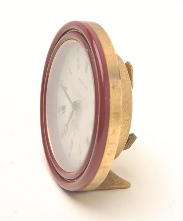 Lot 46 Vintage Tiffany & Co. small Swiss wind-up alarm clock marked on face “8 days; 15 jewels”, approxim