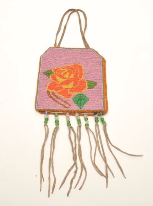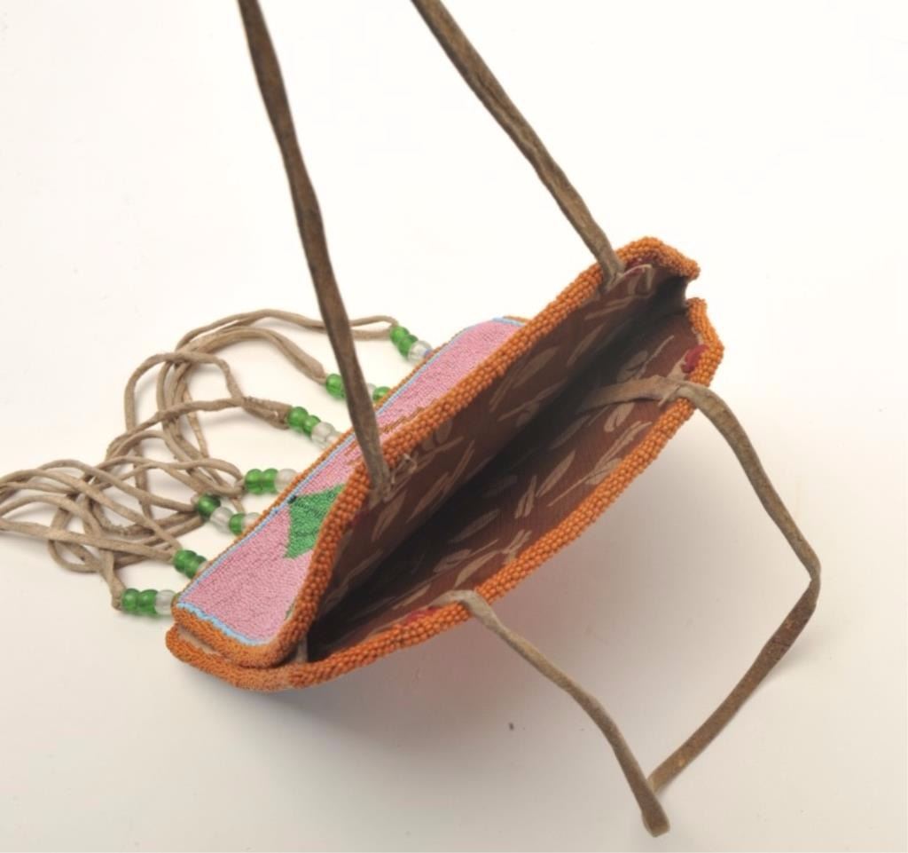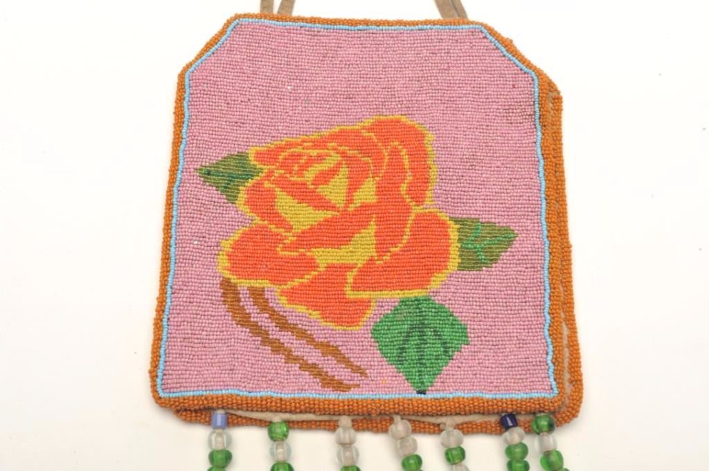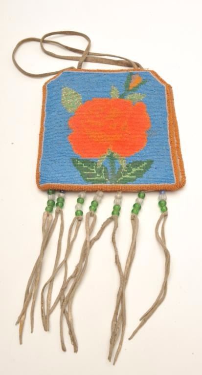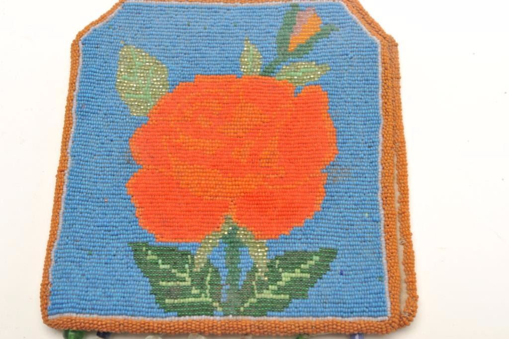 Small colorful beaded pouch with floral designs; approximately 7” x 6.5” in very good condition with fringe and beaded accents. Est.: $125-$250.