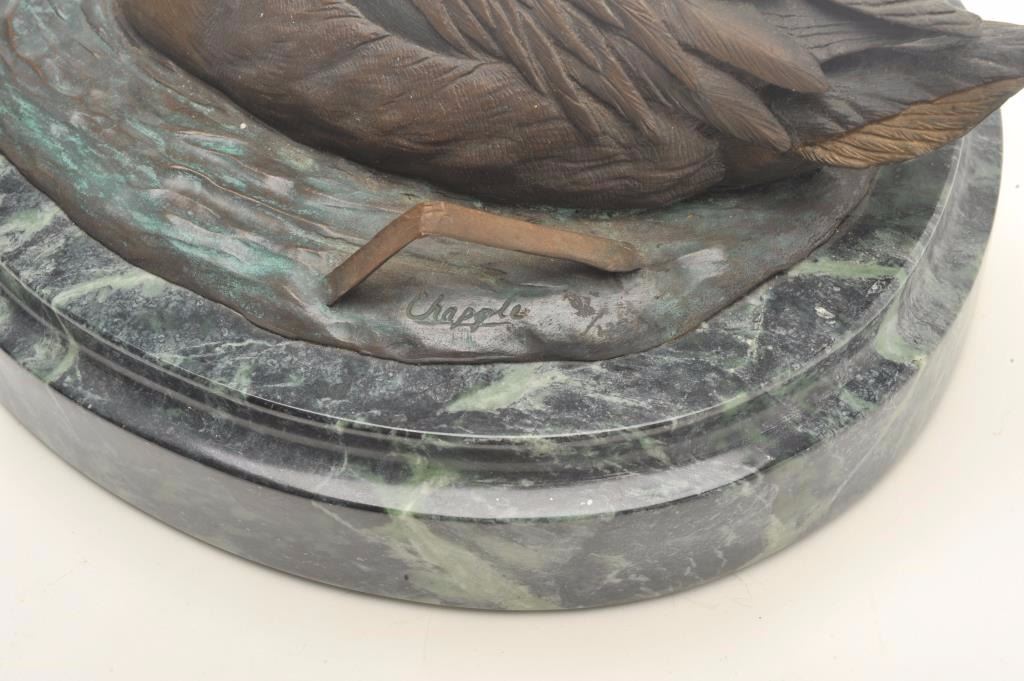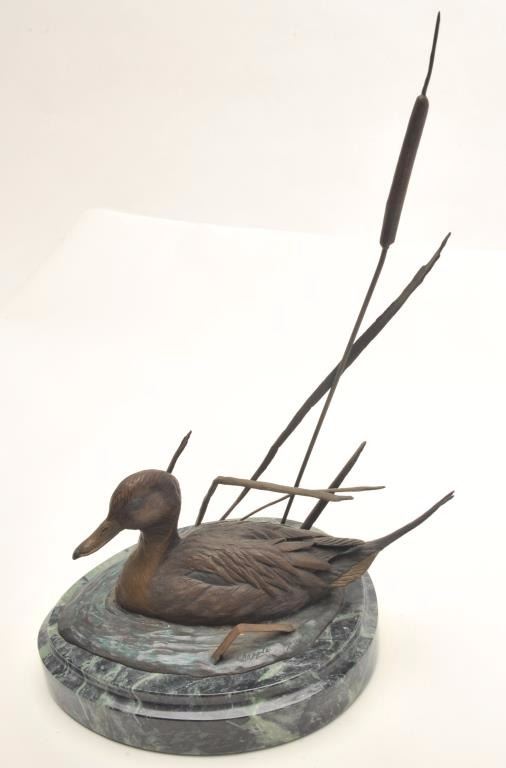 Nicely detailed and polychromed bronze of a pintail duck in reeds by Chapple, #96/125, mounted on a marble base, overall approximately 18” high x 10” long x 8” wide. Est.: $400-$800.