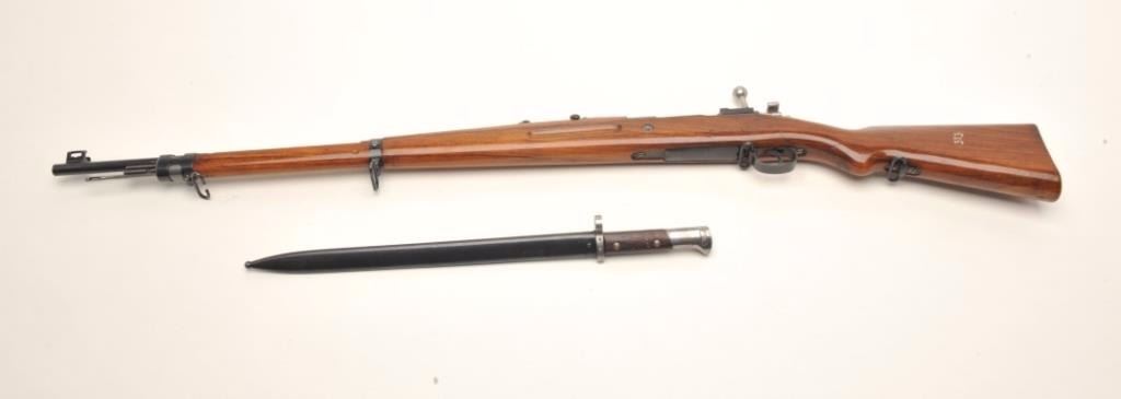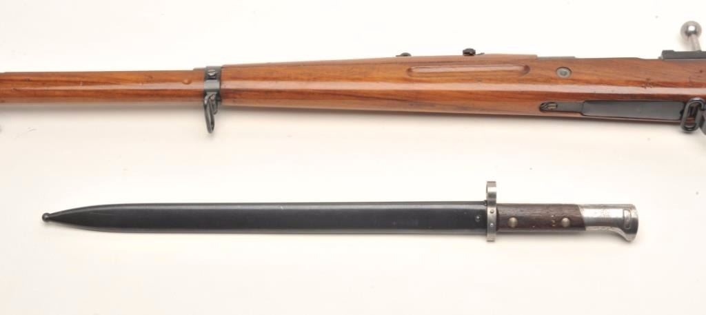 Persian Mauser bolt action rifle, 7.92mm caliber, 29.5” barrel, blued finish, wood stock, import marked, S/N C06101, in overall very good to fine condition with a fine bore, crisp action, sharp markings and very goodto fine wood with some scattered old mars from storage. Accompanied by a bayonet and metal scabbard in overall very good to fine condition. (C&R). Est.: $600-$1,200.