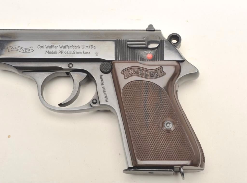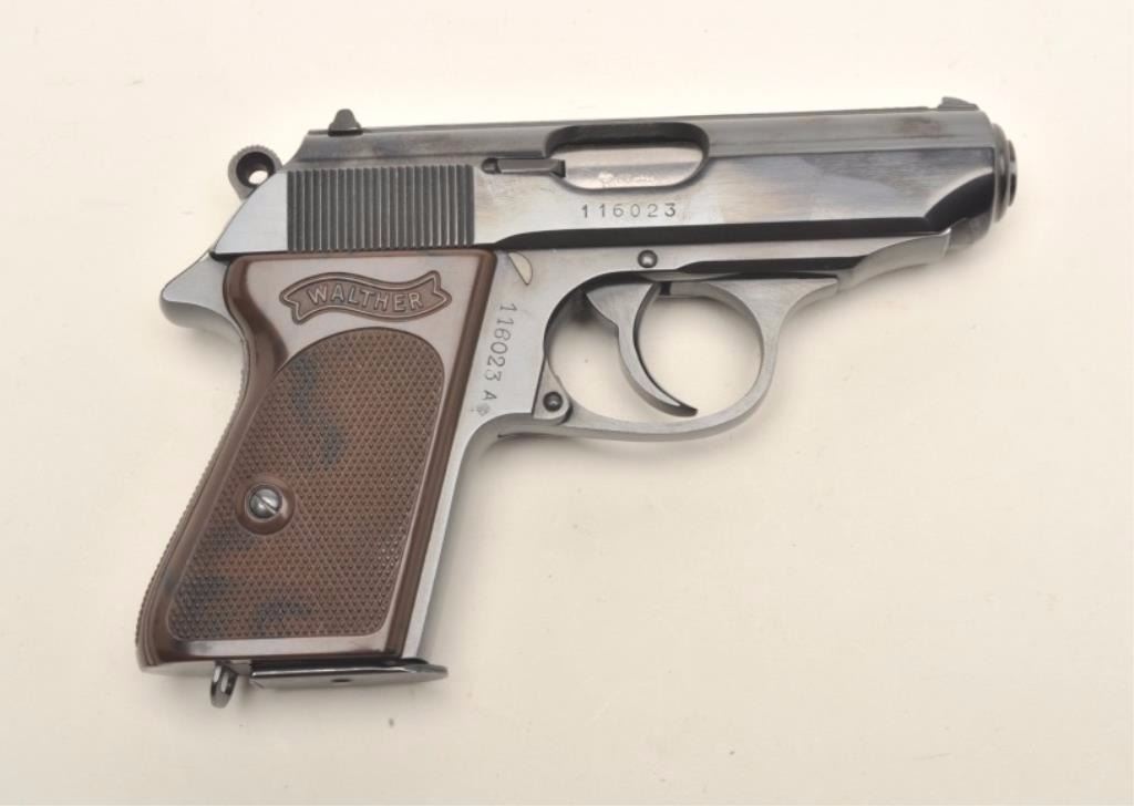 Walther PPK semi-automatic pistol, 9mm Kurz caliber, serial #116023A. The pistol is in very good to nearly excellent condition with a 3 ½” barrel. The pistol retains nearly all of its blued finish with only handling marksnoted. The pistol features a ringed hammer and is marked made in West Germany but shows no import marks. The checkered plastic, Walther marked grips are in very good condition with only storage wear. The bore is very good, the action is crisp and markings are sharp. The pistol comes with one correct, Walther marked magazine. A most desirable West German marked Walther of which James Bond himself would approve. Est.:$600-$1,200. (Modern).