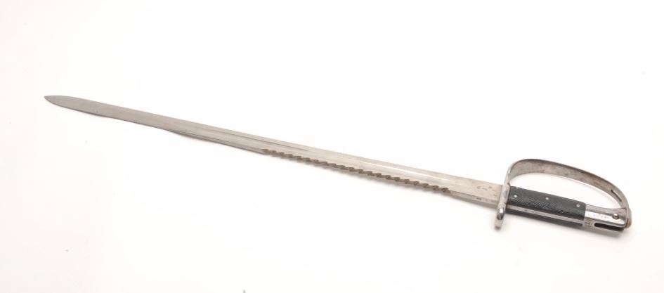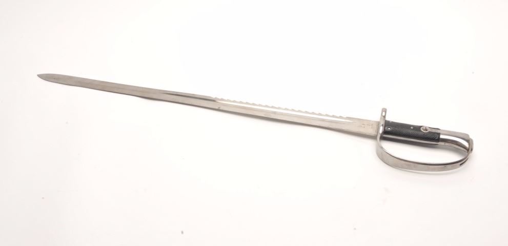 British Model 1879 Engineers sword bayonet (no sheath), in overall very good to fine condition; nicely proofed and marked “11/82” at base of left side of blade; sawtooth back, checkered grip. Est.: $600-$1,200.