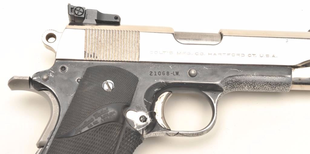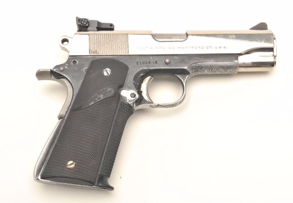 Colt Combat Commander semi-auto pistol, .45 ACP caliber, serial #21068-LW. The pistol is in good overall condition with a 4” barrel as customized. The slide retains nearly all of a hard chrome re-finish while the frameremains blued. A blade front and adjustable target rear sights have been added. The frame has had stippling and hand etching applied to the underside and trigger guard for what appears to be for a decorative purpose. Thecheckered rubber Pachmayr wrap around grips are in good condition showing use. The bore is good, the action crisp and markings are sharp. The pistol comes with one, correct Colt marked magazine. Est.: $600-$1,200.