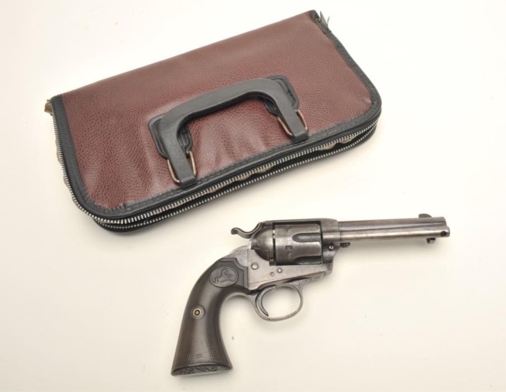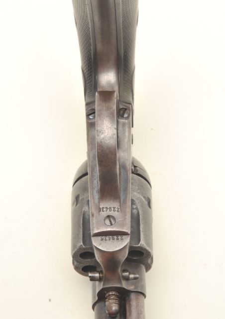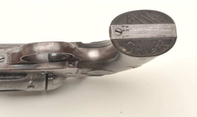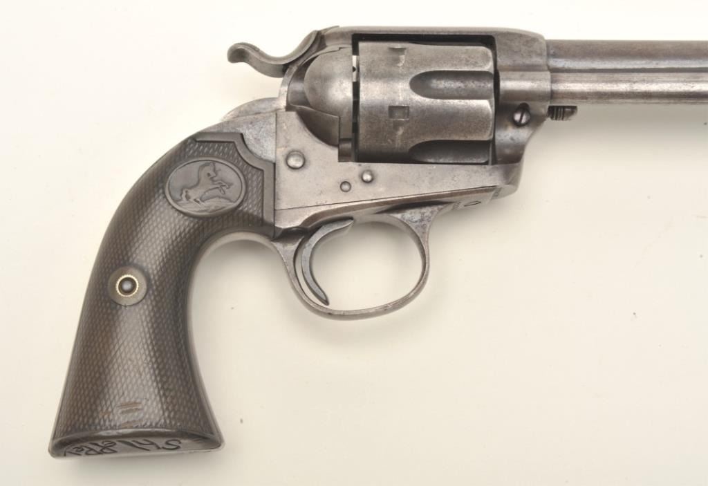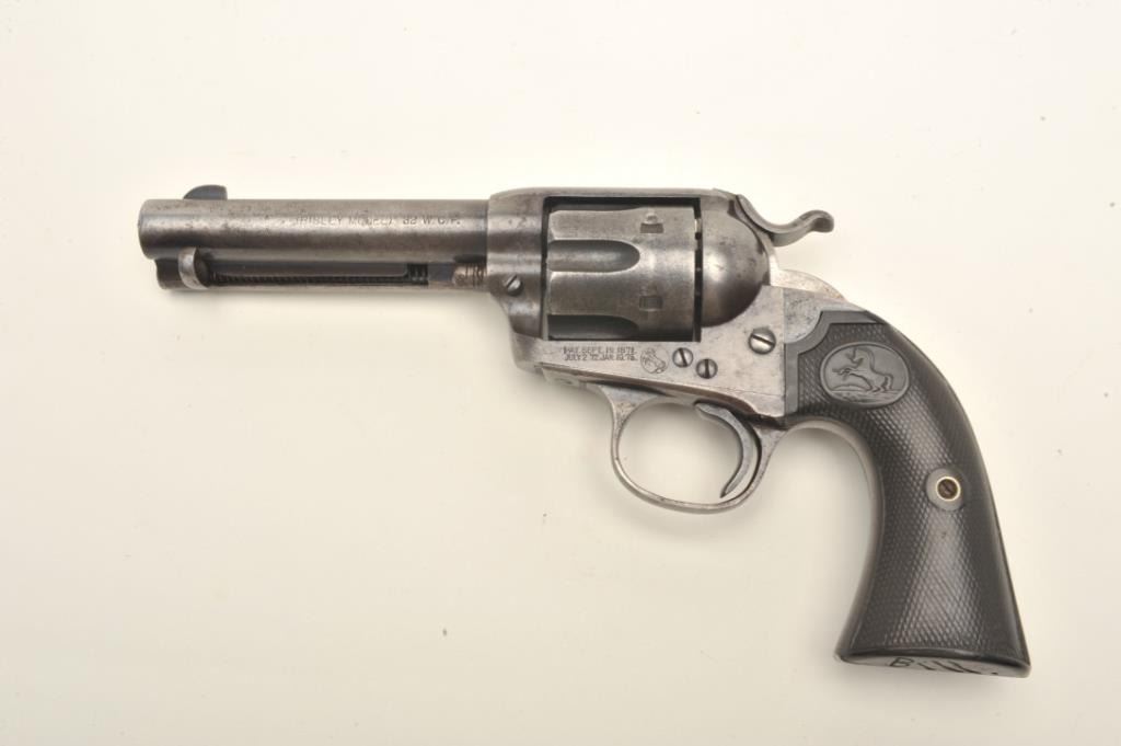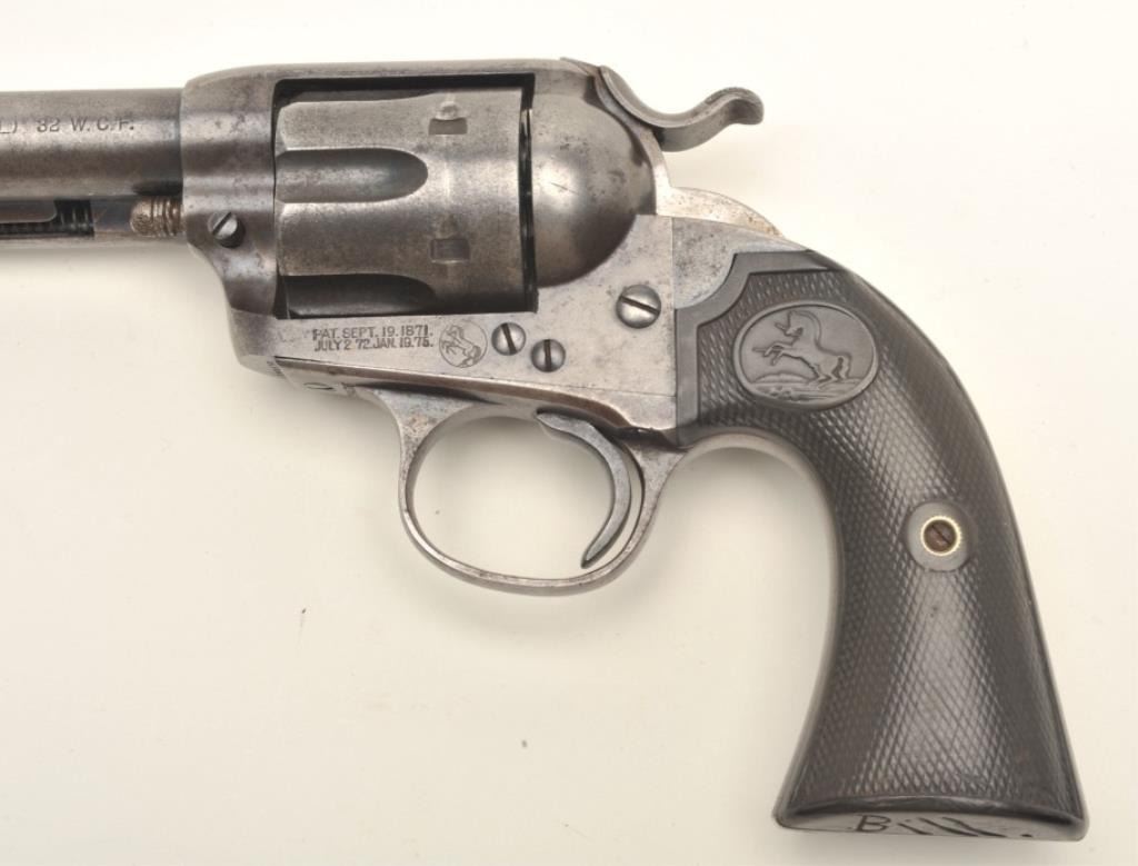 Colt Bisley Model Single Action revolver, .32-20 caliber, 4.75” barrel, blued and case hardened finish, checkered hard rubber grips with “Bill Shleppey” carved into bottom of the grips, S/N 229436, in overall goodcondition showing traces of original blue in protected areas, some scattered pinprick pitting, good bore, crisp action, good markings and grips. (C&R/PPT). Est.: $1,000-$2,000.