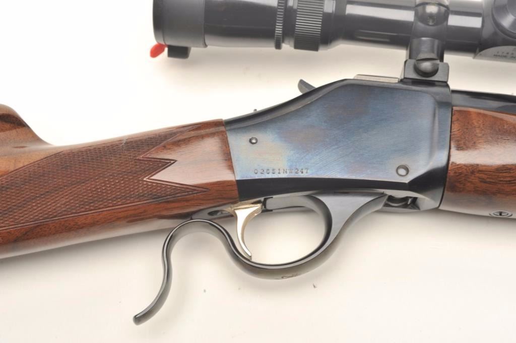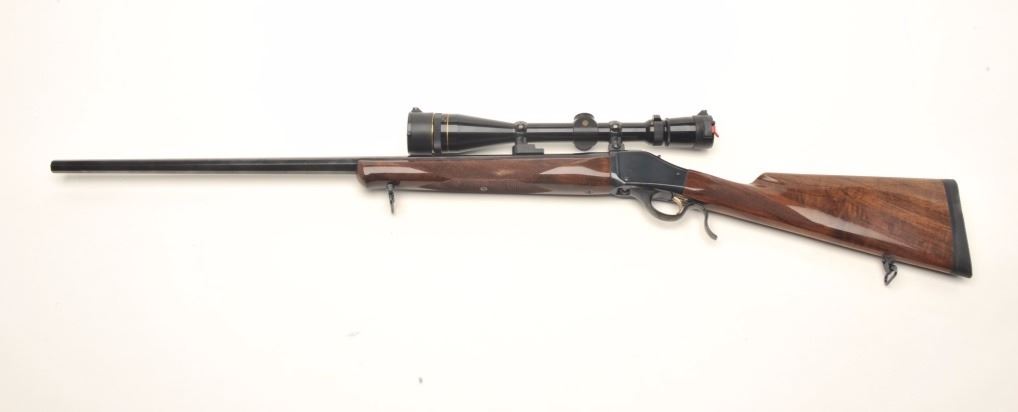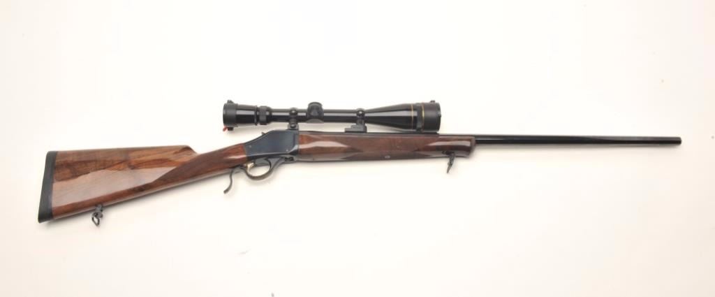 Browning Model 1885 single shot rifle, .22-250 caliber, 28” octagon barrel, blued finish, checkered wood stocks with beautiful graining, quick release sling swivels, S/N 02651NW247, mounted with a Leupold Vari-X III 6.5x20 scope displaying crisp optics; the rifle is in overall like new condition. (Modern). Est.: $500-$1,000.