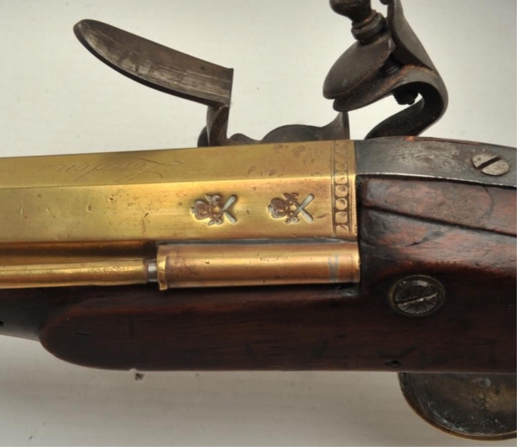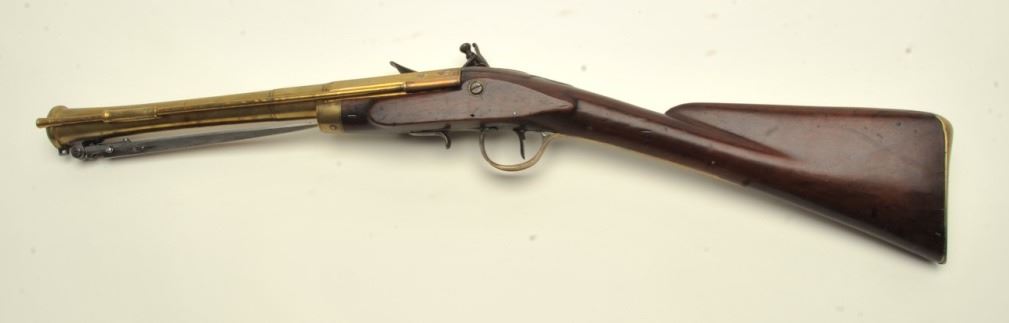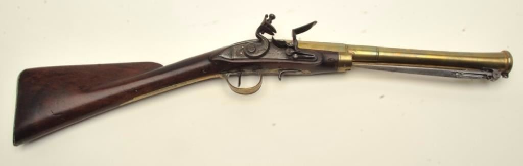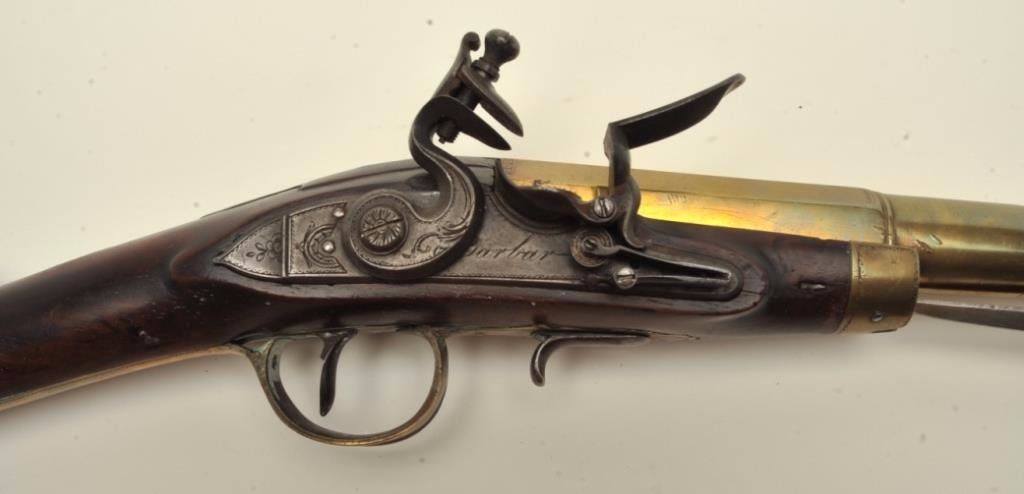 Brass barrel flintlock blunderbuss by Barbar with under mounted spring bayonet, half stock, and side mounted ramrod circa 18th to early 19th century. Measures 30” overall with 14 ¼” brass barrel constructed in 3 stageswith ringed cannon muzzle of 1 ¼” across inner edge with thick walls. In good to very good condition overall with good markings and wood along with some minor pitting on the bayonet. All original flintlock parts and not rubbed out. A premium maker. (Antique) Est.:$2000-$4000