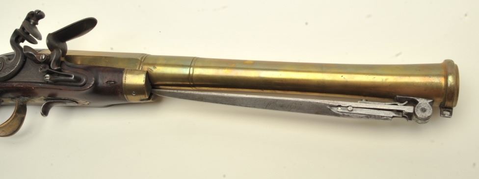 Lot 125a Brass barrel flintlock blunderbuss by Barbar with under mounted spring bayonet, half stock, and si
