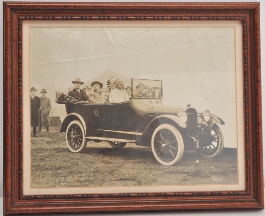 Original photo of Buffalo Bill Cody and an Indian Chief riding in an open touring car with the emblem “101” (Ranch) on the passenger side door; framed, approximately 9.5” x 11.5” overall and in good conditionwith some creasing and folds at the top but not affecting the great image. Est.: $200-$400.