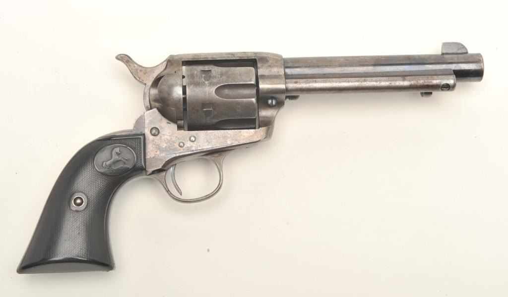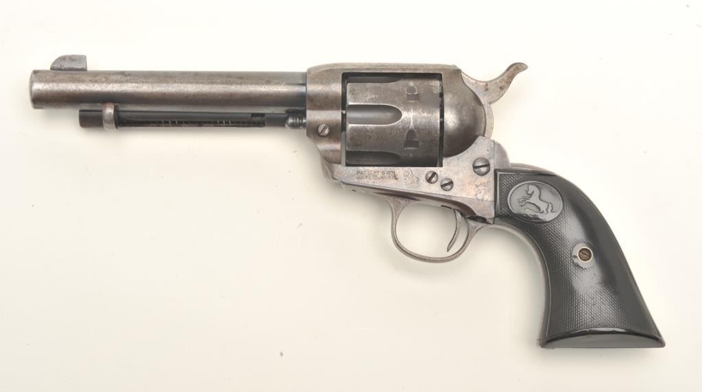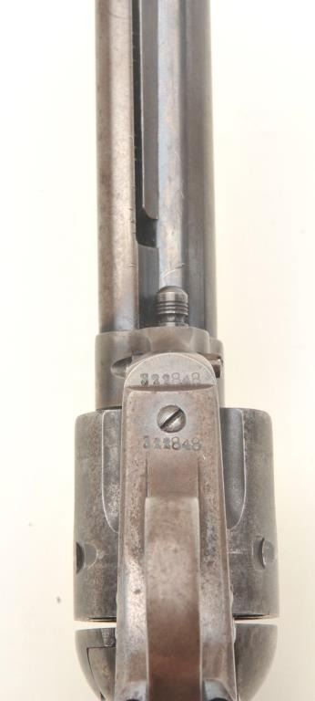 Colt SAA revolver, .38 W.C.F. caliber, 5.5” barrel, blued and case hardened finish, checkered hard rubber grips, S/N 322848 (all matching visible numbers), in overall very good condition with traces of original blueand case colors in protected areas, action crisp, markings sharp, good grips showing handling wear to left grip but good overall; factory letter confirms features and indicates shipment to Salt Lake CityHardware, SLC, Utah. (C&R/PPT). Est.: $2,000-$3,000.