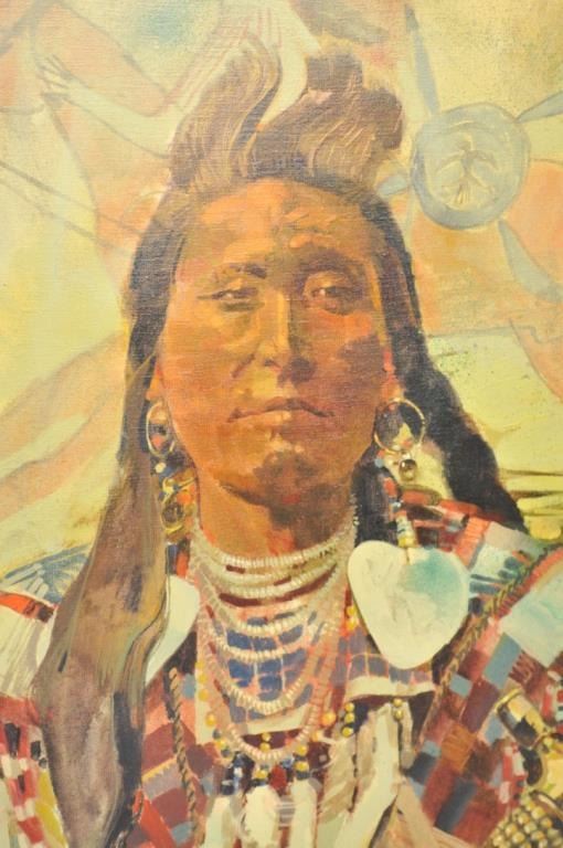 Lot 149 Original oil on canvas signed lower right “Boyle ‘77” and entitled on back “Crow Chief”. Measures