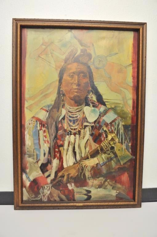 Original oil on canvas signed lower right “Boyle ‘77” and entitled on back “Crow Chief”. Measures approximately 36” x 24”. Nicely framed and no condition issues. Excellent subject matter with well researched material. Neil Boyle was born 1931 and died 2006. Very highly trained and credentialed artist whose works are in Smithsonian and grew up in Indian country where his father was an honorary chief of the Piegan tribe.Est.: $2000-$4000