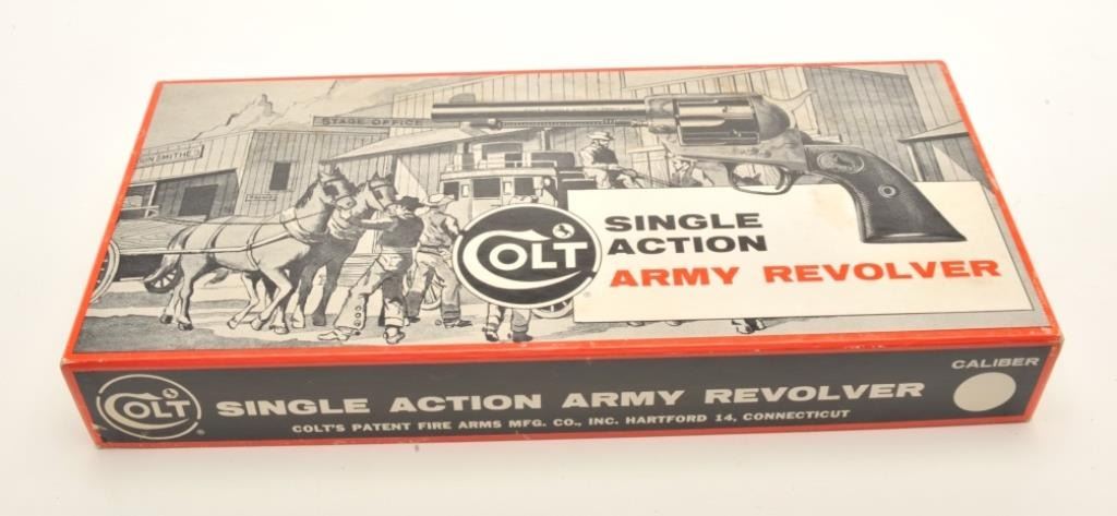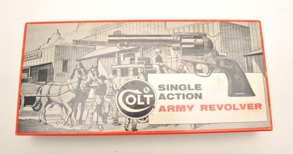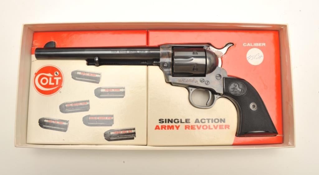 Colt 2nd Generation SAA revolver, .45 caliber, 7.5” barrel, blued and case hardened finish, checkered hard rubber grips, S/N 45127SA, in near mint condition with desirable factory stagecoach two piececardboard box and instructions. (C&R/PPT). Est.: $2,000-$4,000.