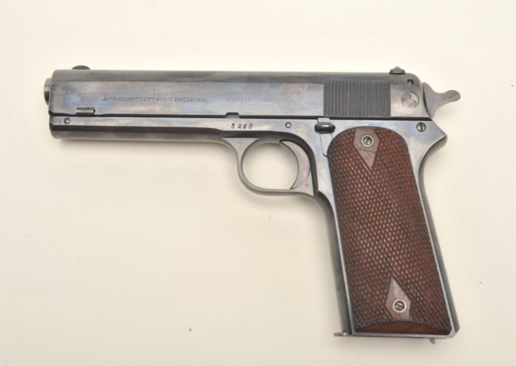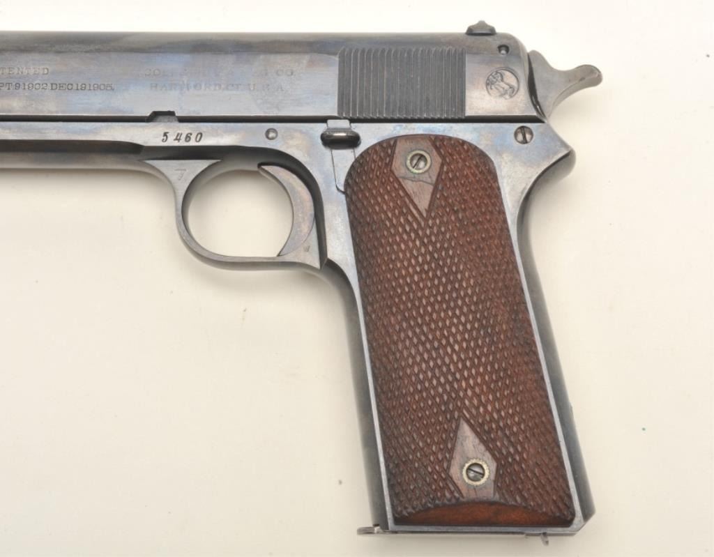 Colt Model 1905 semi-automatic pistol (ca. 1911), .45 Rimless Smokeless caliber, 5” barrel, blued finish, checkered wood grips, S/N 5460, in overall fine to excellent condition displaying approximately 99%original finish, fine bore, crisp action, fine grips. Per Flayderman’s Guide (5B-232), approximately 6,100 manufactured between 1905-1911. (C&R/PPT). Est.: $3,000-$6,000.