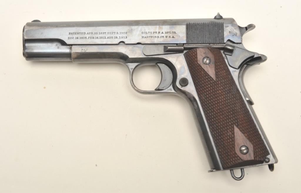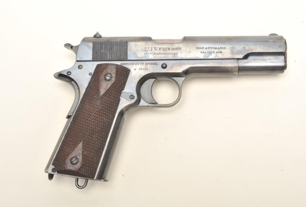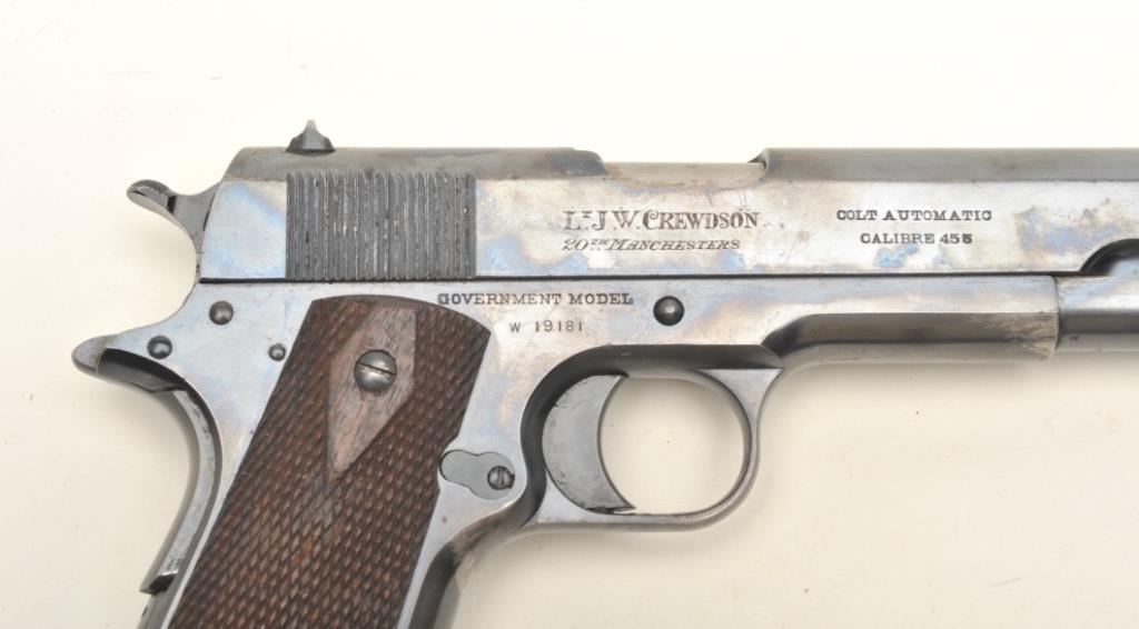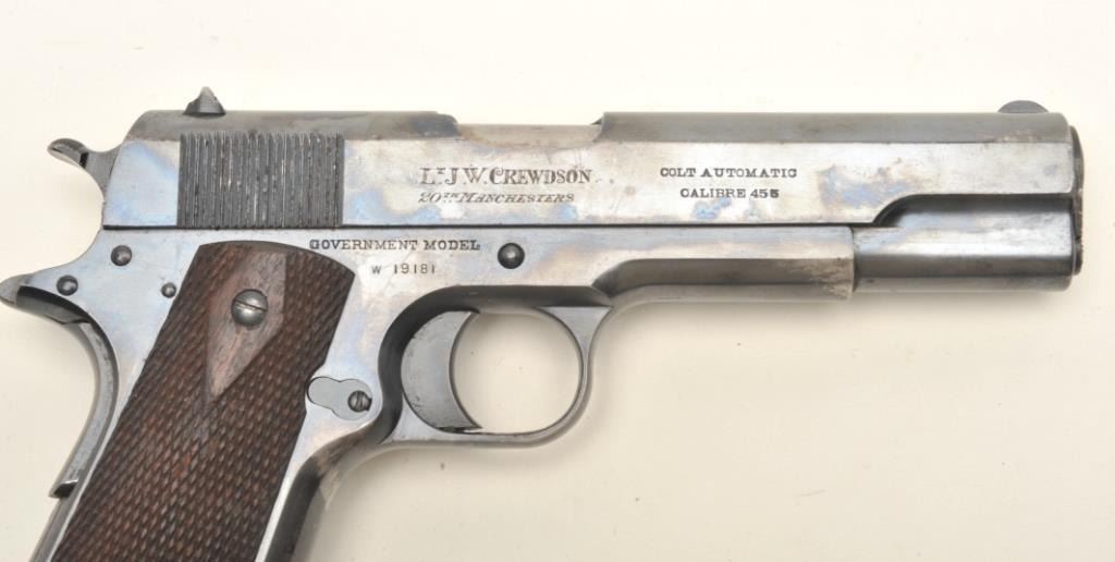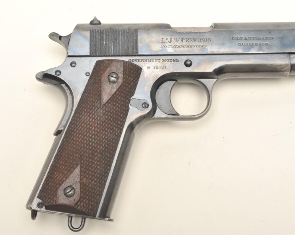 Colt British Contract Government Model 1911 semi-automatic pistol, .455 caliber, 5” barrel, blued finish, checkered wood grips with two tone magazine and lanyard ring, S/N W19181 (contract ca. 1915-16); inscribed onthe right side of the slide “Lt. J. W. Crewdson/20th Manchesters”; in overall fine condition displaying the majority of its original finish with some scattered high point wear, fine bore, crisp action andmarkings, fine grips. Per Sutherland and Wilson’s The Book of Colt Firearms, approximately 11,000 of this variation were produced; serialized in their own number range beginning with W10001.(C&R/PPT). Est.: $1,750-$3,500.