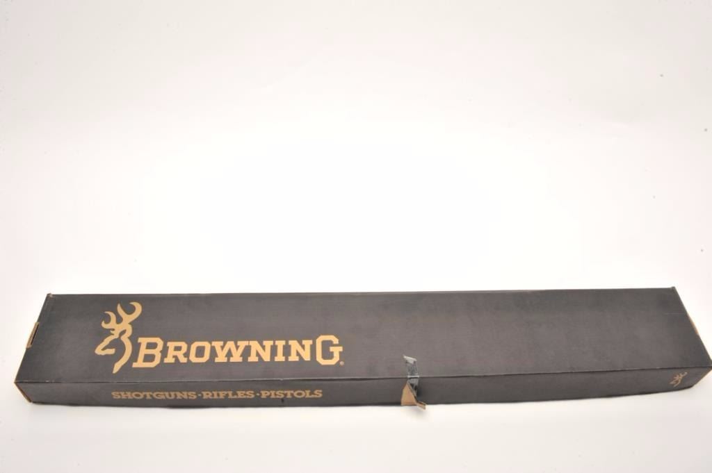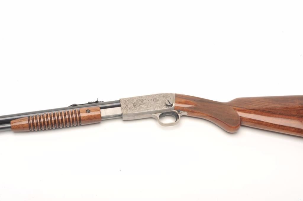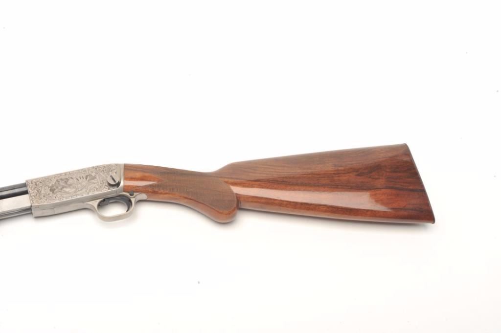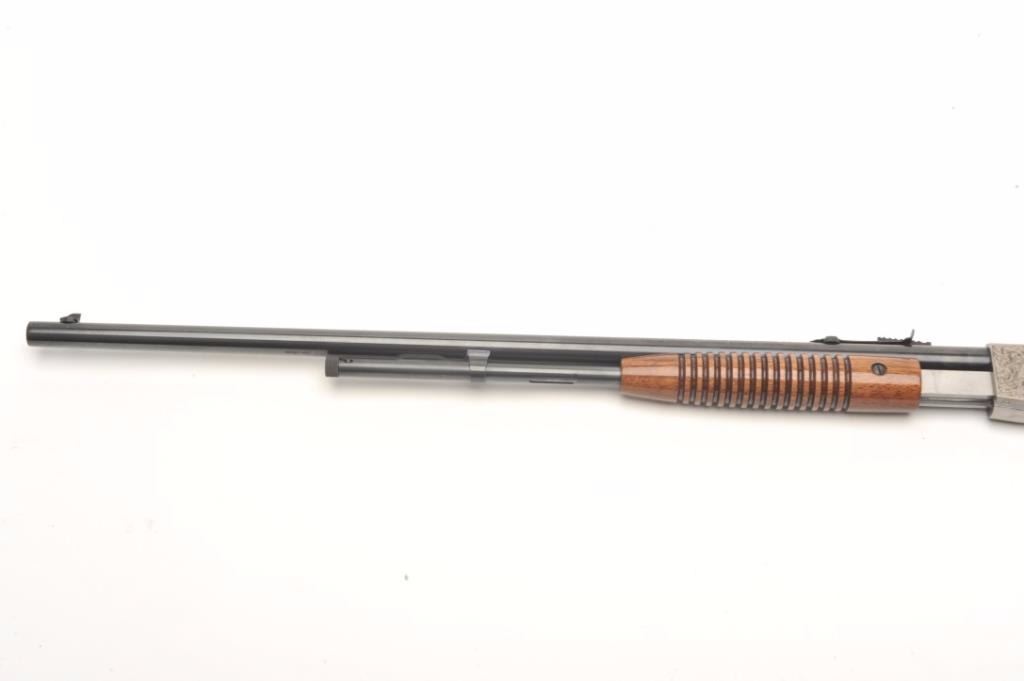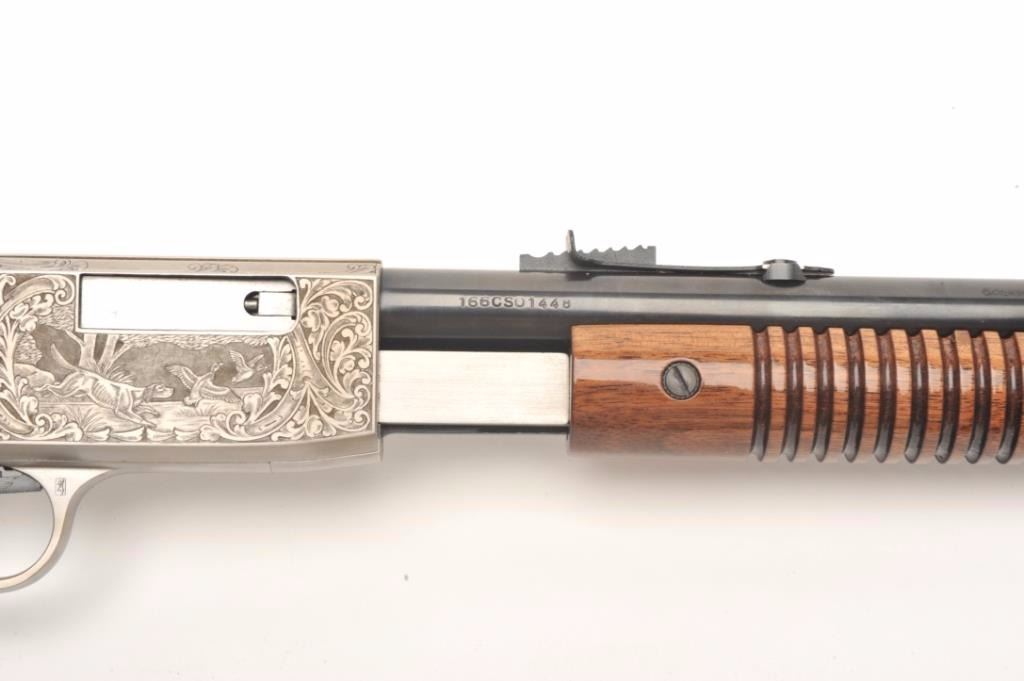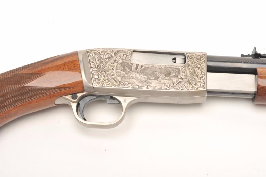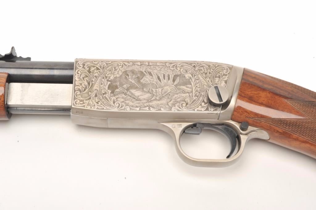 Browning Trombone Grade III Takedown pump action, .22 LR caliber, serial #166CS-01448. The rifle is as new in the original box with all associated packing materials. The rifle features a 22” round barrel with halfmagazine. The barrel and magazine retain all of their high polish blued finish. The receiver is coin finished with beautiful relief engraving of game scenes on both sides of the action. The underside of the actionshows Belgian proofs, while the trigger guard is marked, “G III”. The finely checkered, high gloss wood stocks are in excellent condition featuring nice grain and fine figure in the walnut. The butt features around knob pistol grip and ends with a smooth metal butt plate. The bore is excellent, the action crisp and markings are sharp on this exceptional piece. According to the consignor, Browning’s Jack Lanham indicatedthat only four of these exquisite Trombones were imported. The lot features the certificates and documentation Id’s as provided. A rare opportunity to own an extraordinary Belgian Browning master piece.