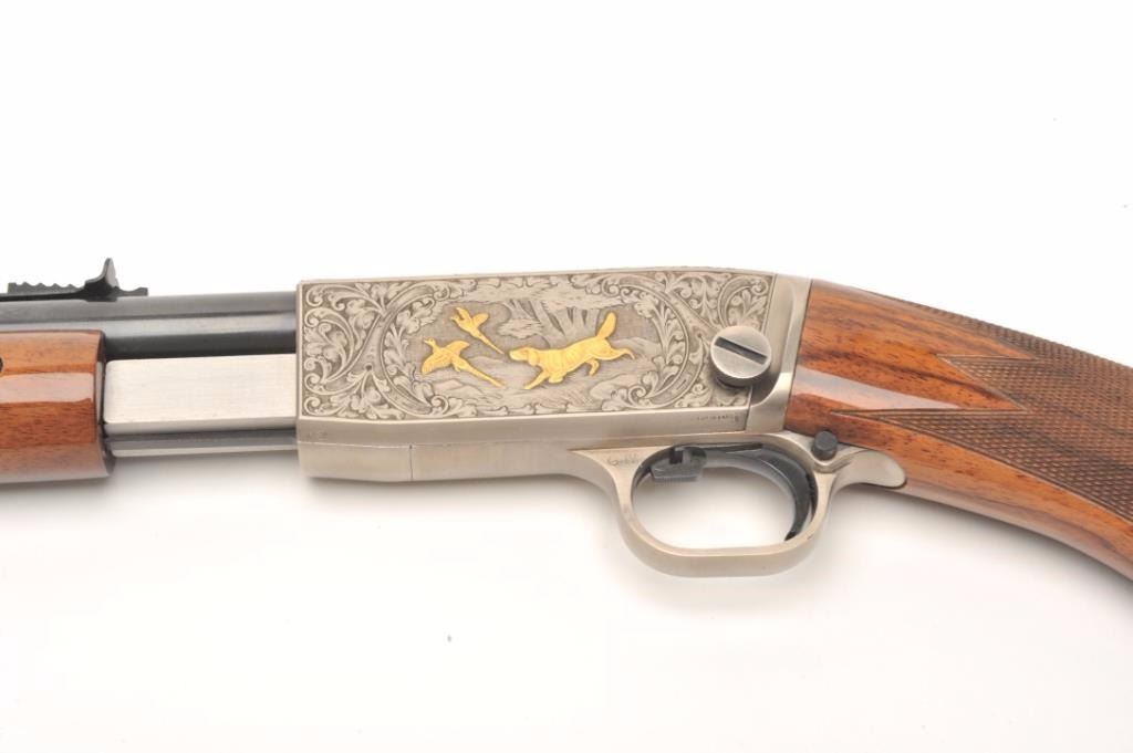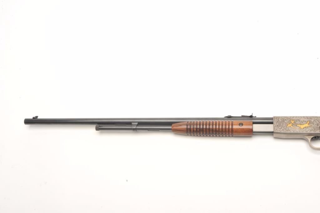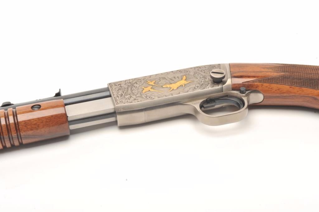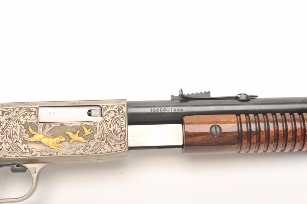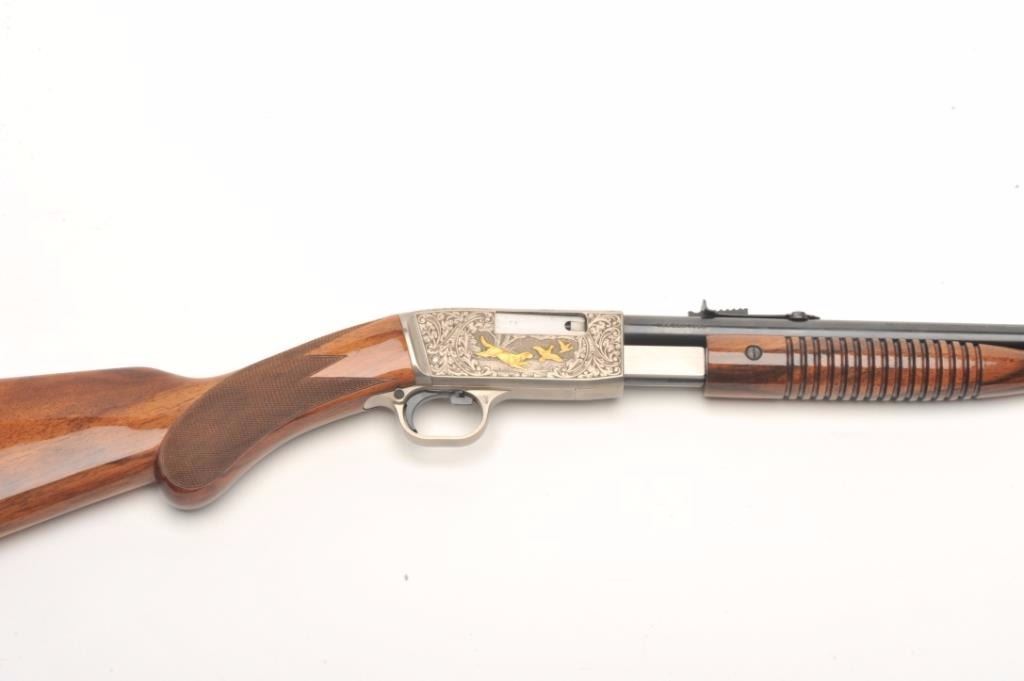Browning Trombone Grade IV Takedown pump action, .22 LR caliber, serial #166CS-01453. The rifle is as new in the original box with all associated packing materials. The rifle features a 22” round barrel with halfmagazine. The barrel and magazine retain all of their high polish blued finish. The receiver is coin finished with beautiful relief engraving and gold inlayed game scenes on both sides of the action. The undersideof the action shows Belgian proofs, while the trigger guard is marked, “G IV”. The finely checkered, high gloss wood stocks are in excellent condition featuring nice grain and fine figure in the walnut. The butt features a round knob pistol grip and ends with a smooth metal butt plate. The bore is excellent, the action crisp and markings are sharp on this exceptional piece. According to the consignor, Browning’s Jack Lanhamindicated that only four of these exquisite Trombones were imported. The lot features the certificates and documentation Id’s as provided. Like the prior lot, this piece is an extraordinary example of Belgian