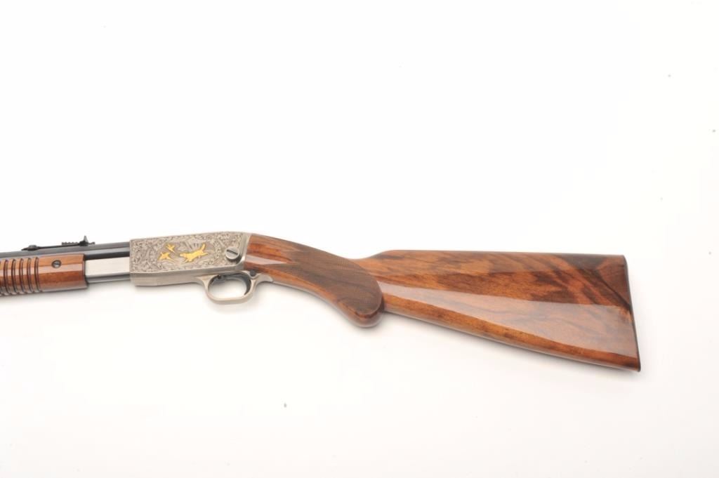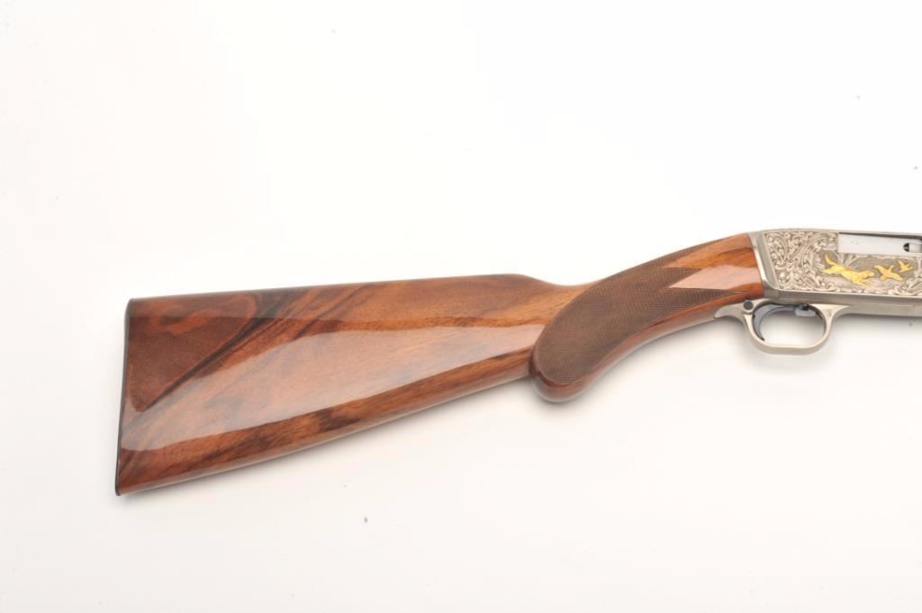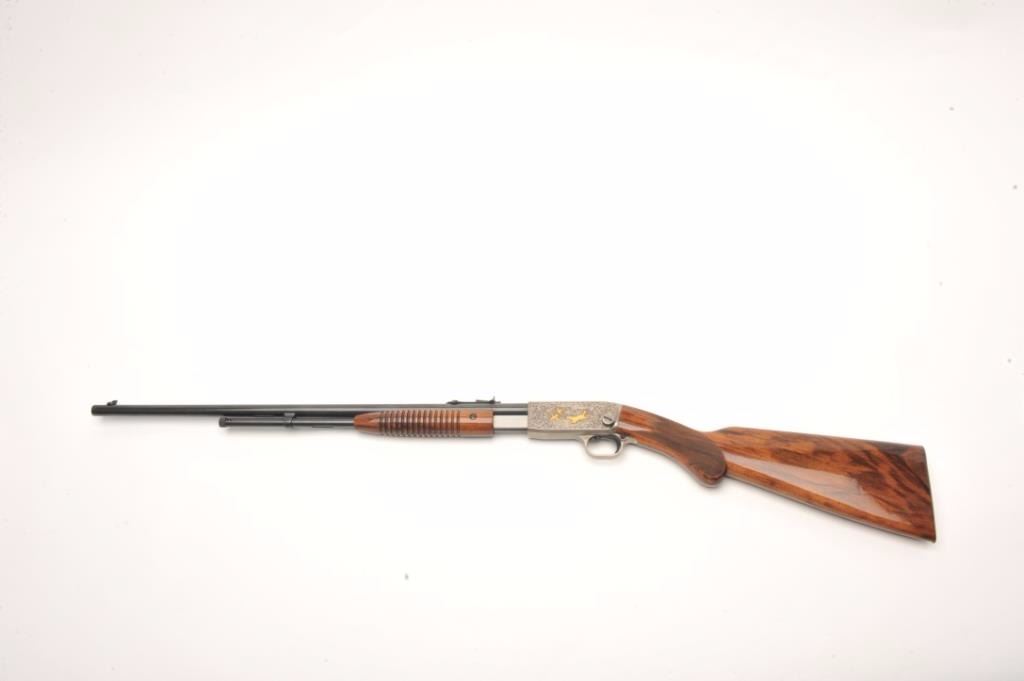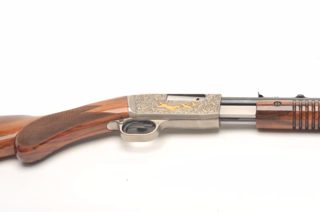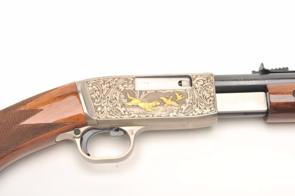 Browning Trombone Grade IV Takedown pump action, .22 LR caliber, serial #166CS-01453. The rifle is as new in the original box with all associated packing materials. The rifle features a 22” round barrel with halfmagazine. The barrel and magazine retain all of their high polish blued finish. The receiver is coin finished with beautiful relief engraving and gold inlayed game scenes on both sides of the action. The undersideof the action shows Belgian proofs, while the trigger guard is marked, “G IV”. The finely checkered, high gloss wood stocks are in excellent condition featuring nice grain and fine figure in the walnut. The butt features a round knob pistol grip and ends with a smooth metal butt plate. The bore is excellent, the action crisp and markings are sharp on this exceptional piece. According to the consignor, Browning’s Jack Lanhamindicated that only four of these exquisite Trombones were imported. The lot features the certificates and documentation Id’s as provided. Like the prior lot, this piece is an extraordinary example of Belgian